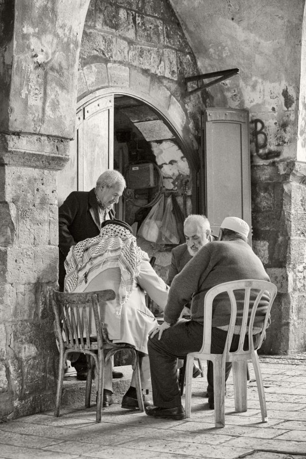 A palladium print of people playing Backgammon taken in Jerusalem in 2008. This palladium print measures 6X9 inches and is in a 16X20 inch frame.