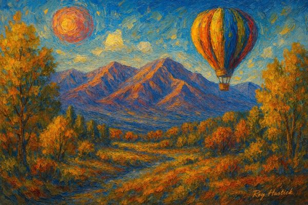 Experience the Sangre de Cristo Mountains through a lens of vibrant color and rhythmic energy. This original piece, created in my Santa Fe adobe studio, captures a whimsical hot air balloon drifting over an autumnal valley.
