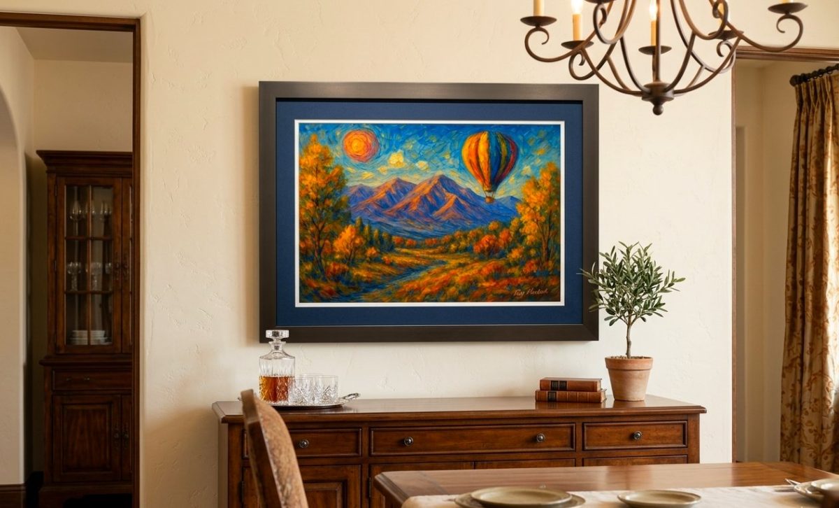 Experience the Sangre de Cristo Mountains through a lens of vibrant color and rhythmic energy. This original piece, created in my Santa Fe adobe studio, captures a whimsical hot air balloon drifting over an autumnal valley.