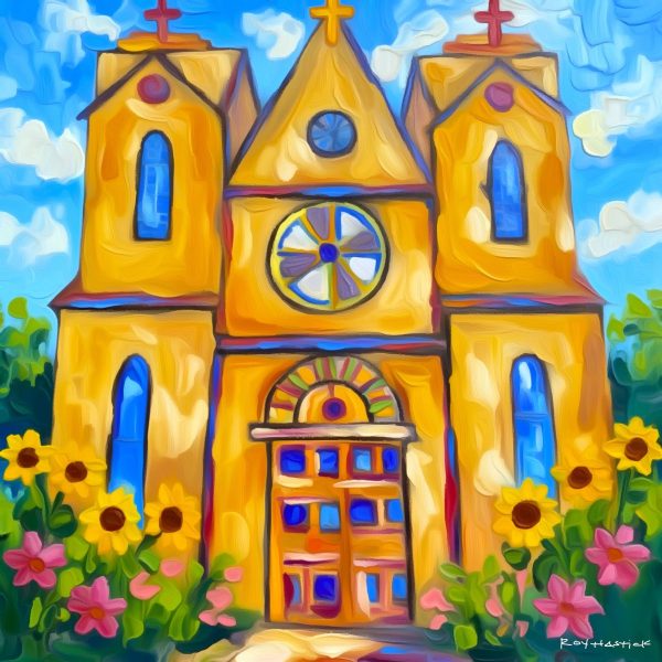 This colorful painting depicts a charming, stylized church, likely inspired by Southwestern architecture, with its warm yellow walls and distinctive blue-hued windows. Three prominent crosses adorn its spires, while cheerful sunflowers and pink blossoms bloom profusely in the foreground, all set against a bright, cloudy blue sky. Rendered in a bold, folk-art-inspired style with smooth, vibrant colors, the artwork evokes a sense of peace, community, and sunny optimism.