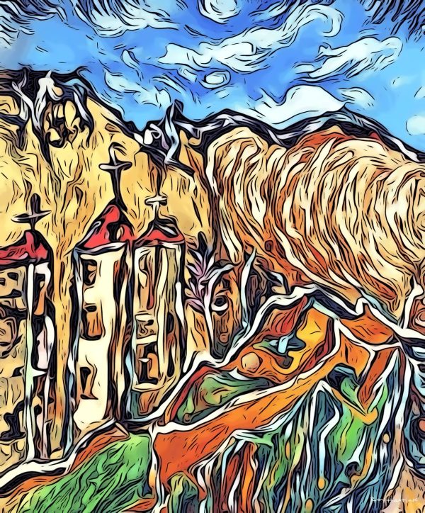 Style and Texture: The artwork utilizes a thick, textural, impasto-like style characterized by highly visible, swirling brushstrokes that give the impression of an oil painting or a digital filter mimicking that effect. Strong black outlines define key shapes, contributing to a bold, graphic look.