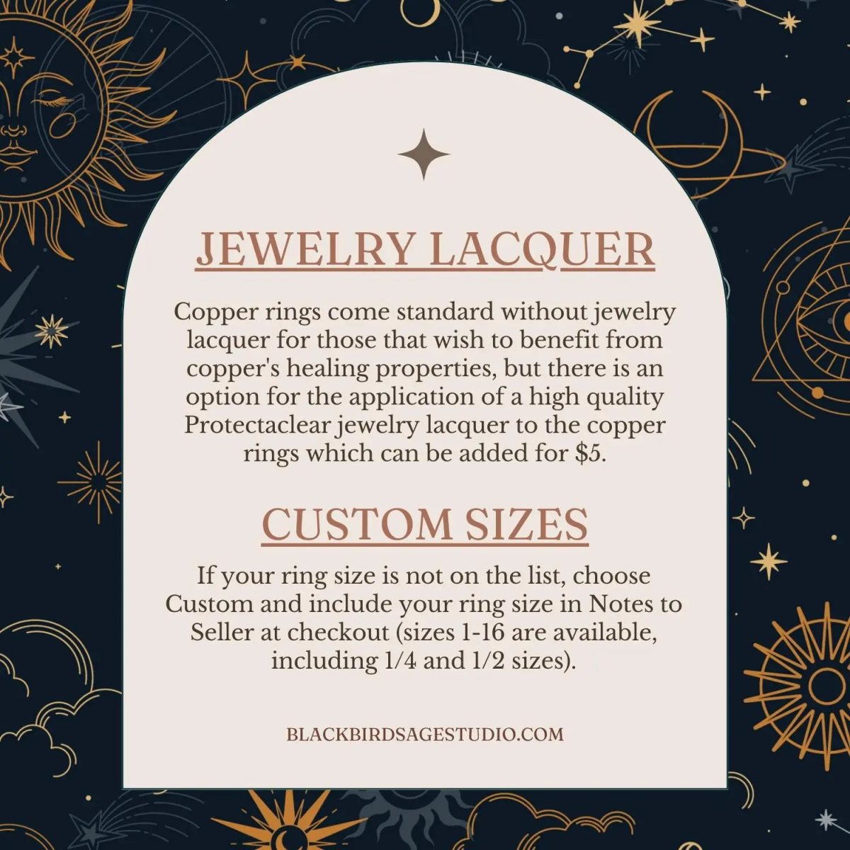 Fit & Wear: Substantial yet comfortable, the copper ring is available in standard US sizes with custom sizing on request. Pair it with layered necklaces or other crystal jewelry to build a personal constellation of meaning.