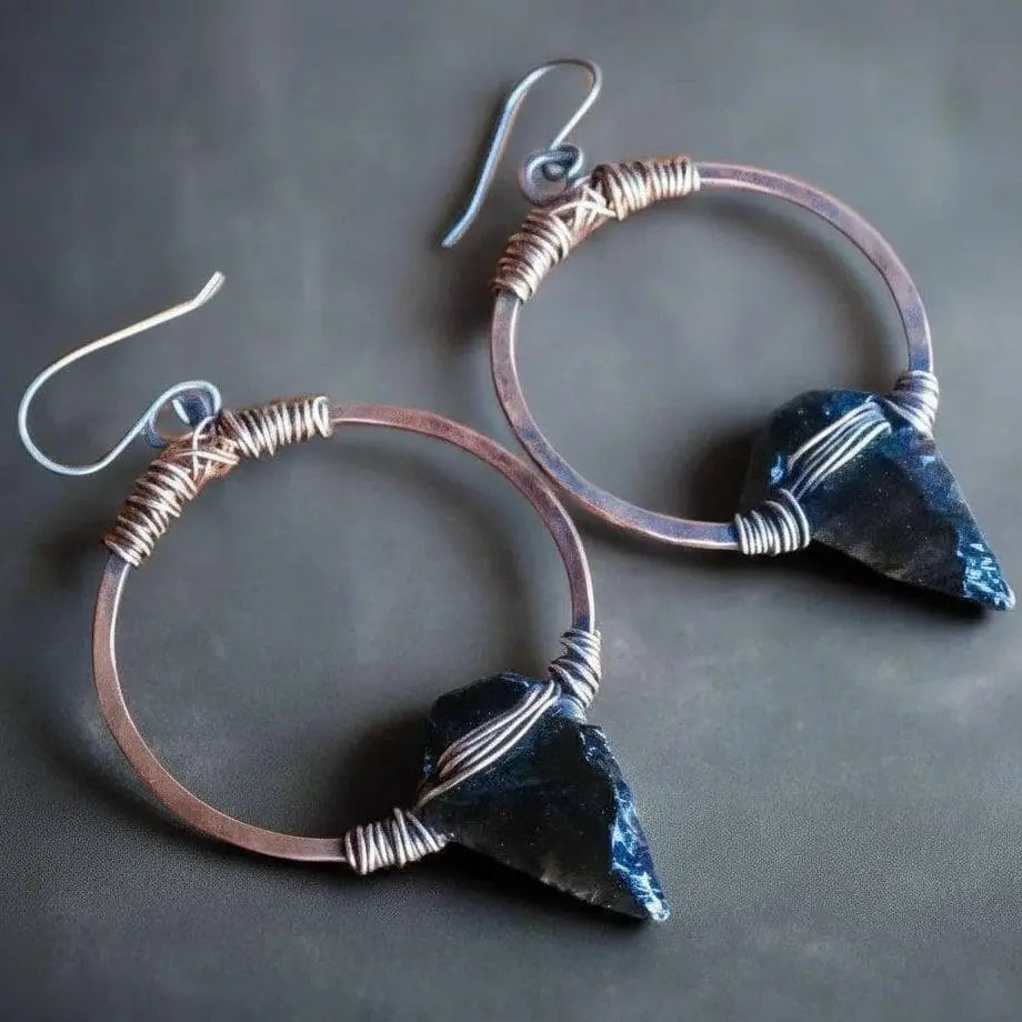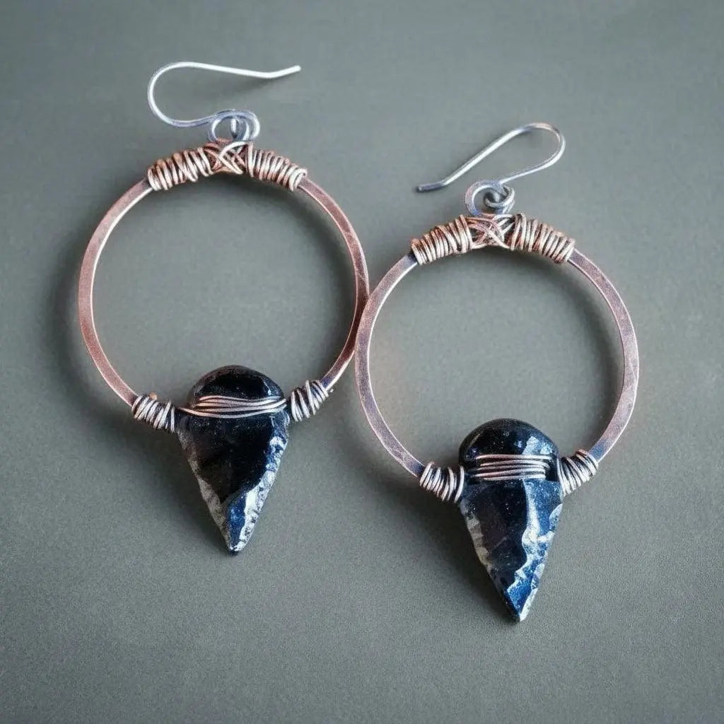 Handcrafted in copper and genuine black obsidian, these arrowhead hoop earrings ground and shield the wearer—an everyday ritual adornment that links earthly metal to focused intent and mindful presence.