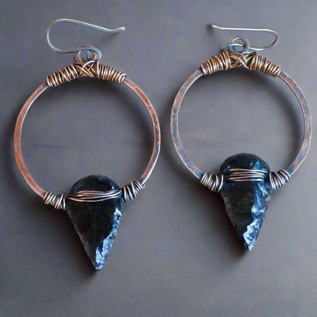 Obsidian Arrowhead Hoop Earrings — Handcrafted Copper Talisman Jewelry
