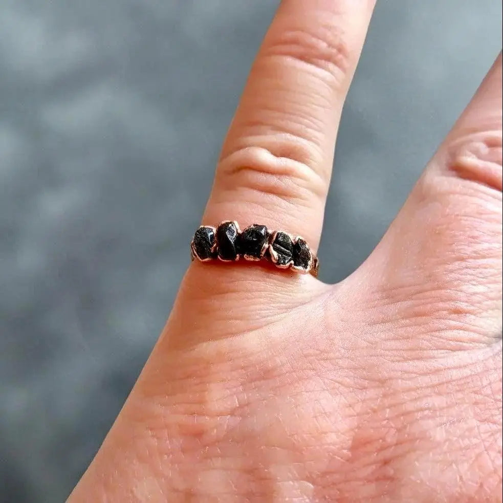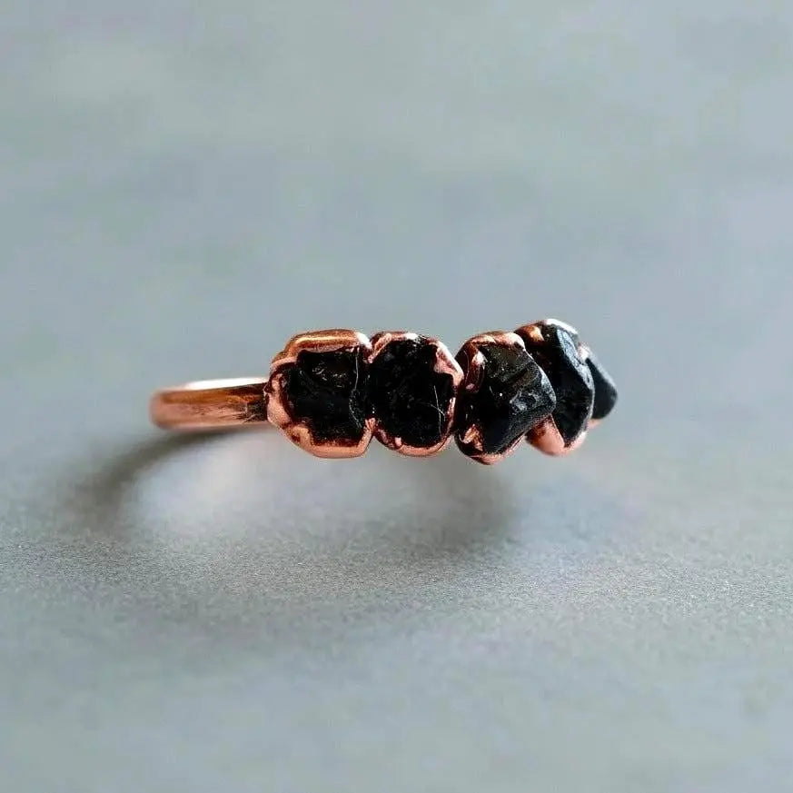 This black tourmaline multistone ring features three genuine raw black tourmaline crystals in their natural striated form—a powerful grounding stone known for protection and energy cleansing. I electroform each piece in my Santa Fe studio, a meditative process where copper is slowly deposited onto the tourmaline crystals and organic elements over many hours, creating an organic, nature-inspired design. The copper develops a living patina that evolves beautifully with you.