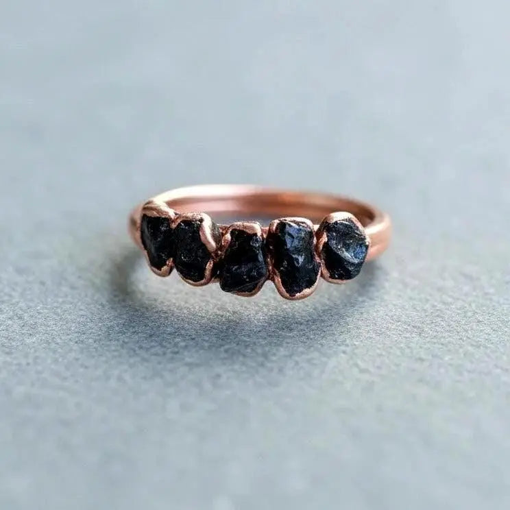 Black tourmaline is relatively durable but treat this handcrafted ring gently to avoid impacts. The copper will develop a beautiful living patina over time—polish with a soft cloth if you prefer brightness. Cleanse energetically by placing on selenite, in moonlight, or with sage smoke. Black tourmaline is known for absorbing negative energy, so cleanse your tourmaline ring regularly, especially after being in challenging environments or around difficult energy.
