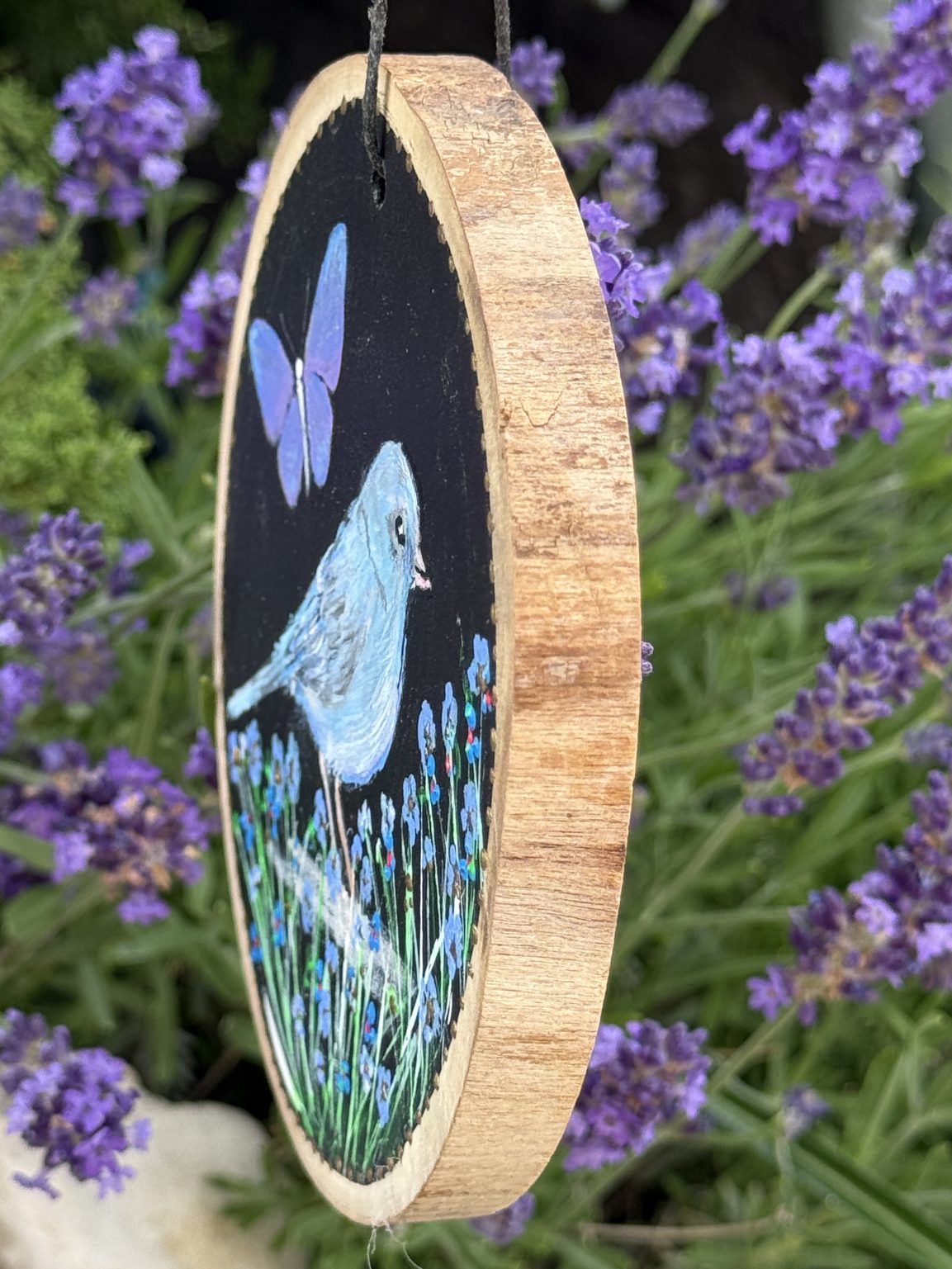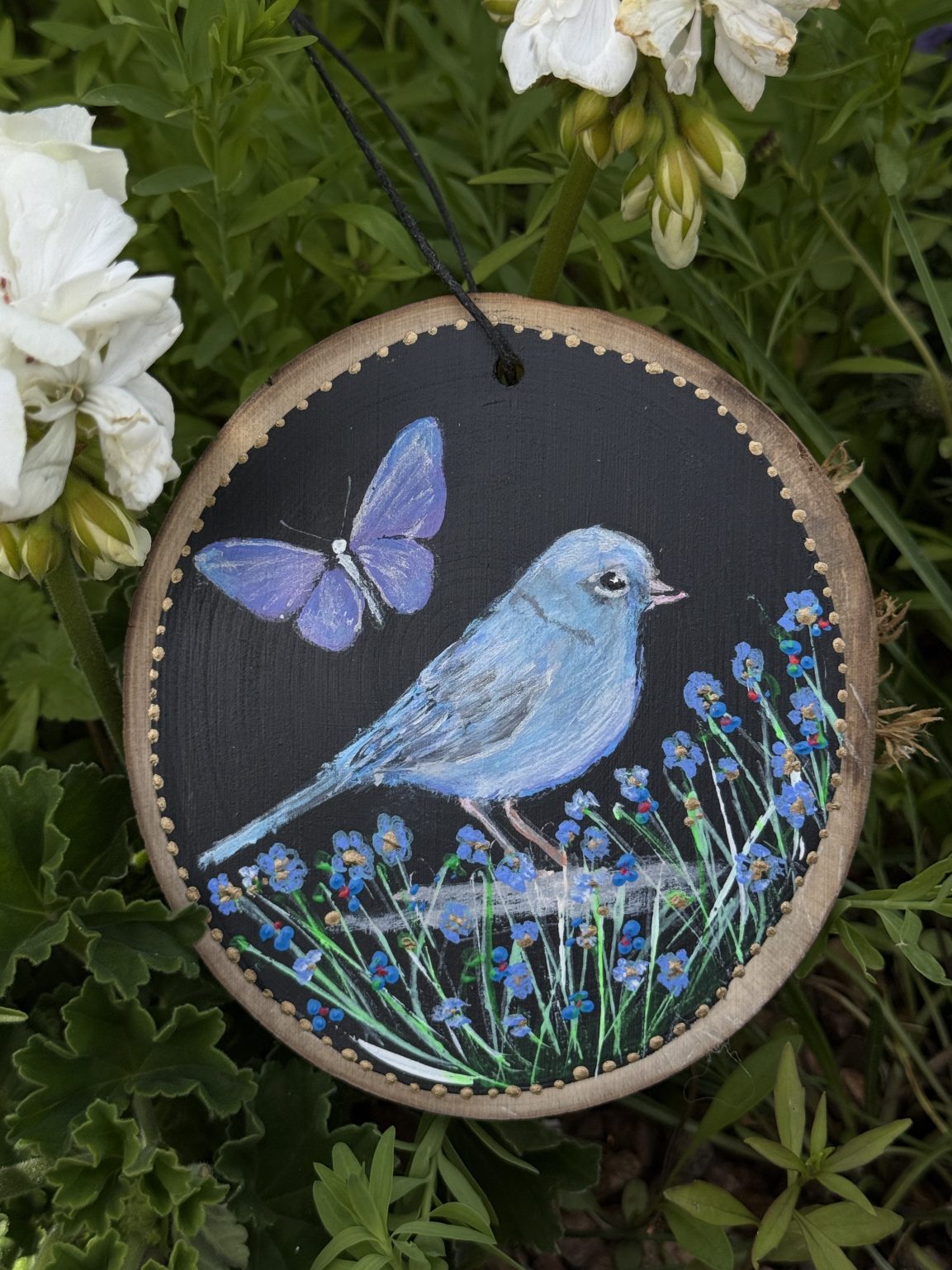 This original meticulously painted wood slice showcases a Western Blue Bird, often seen outside of my Santa Fe home. She is accompanied by a bed of Spring flowers and a free flying purple/blue butterfly depicted in a contemporary modern art style. Ideal for home decor, door knob or window display, holiday ornament, or meaningful handmade one-of-a-kind gift.