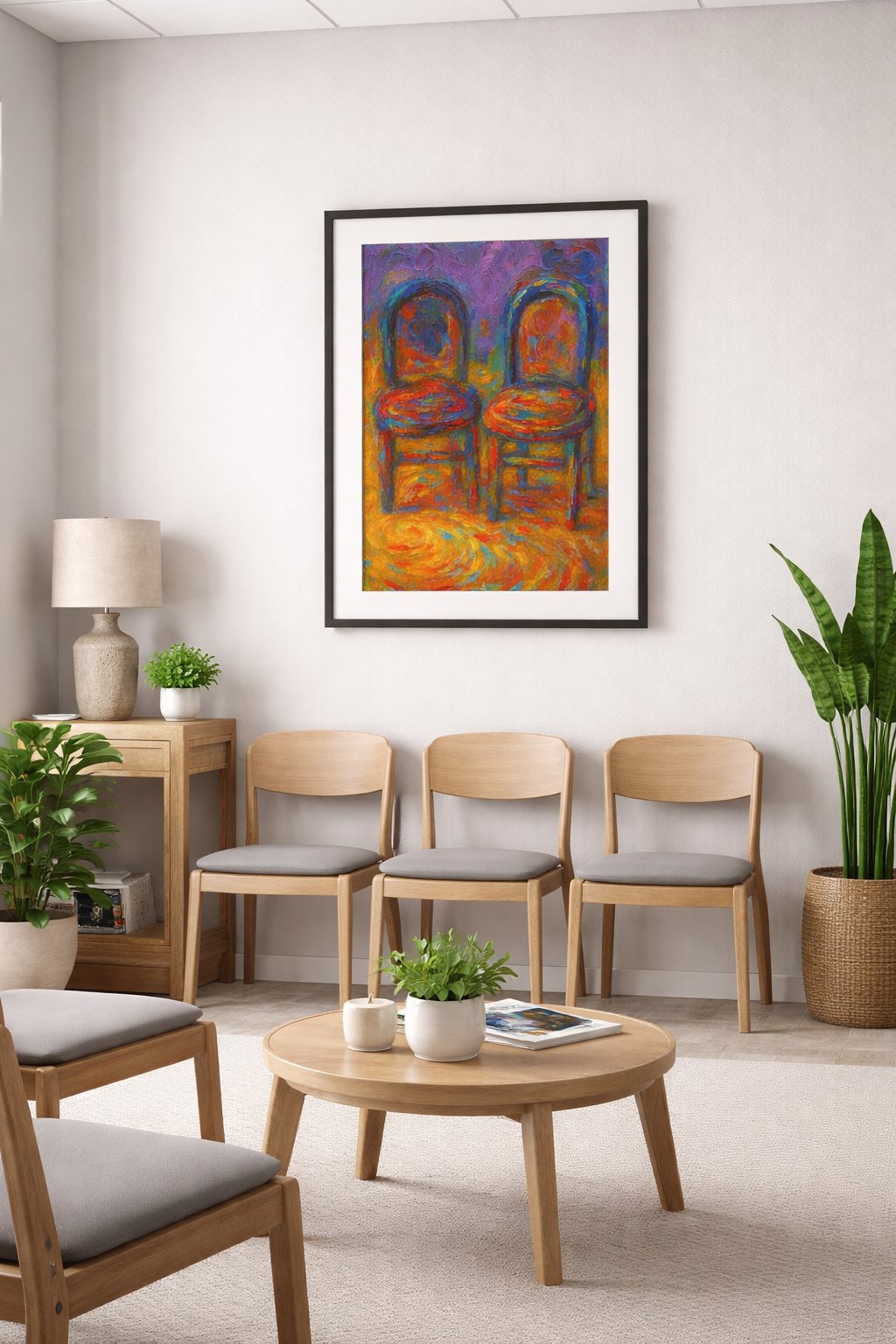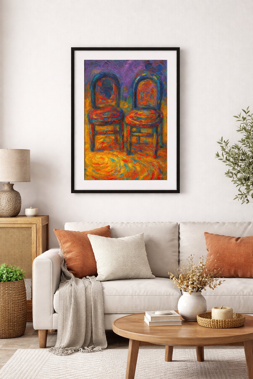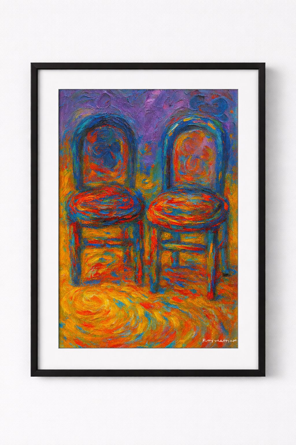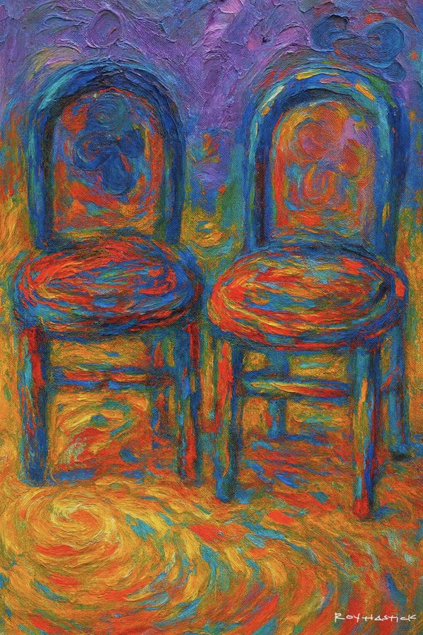 The painting features two side-by-side wooden chairs with rounded backs, set against a backdrop of deep purples and blues. Rather than solid colors, the chairs are composed of a fiery mosaic of oranges, reds, and teals. The floor beneath them is a swirling vortex of golden yellow and burnt orange, suggesting a radiant light source or a kinetic energy emanating from the ground. The heavy texture creates a tactile quality, where the physical movement of the brush or palette knife is as much a subject as the chairs themselves.