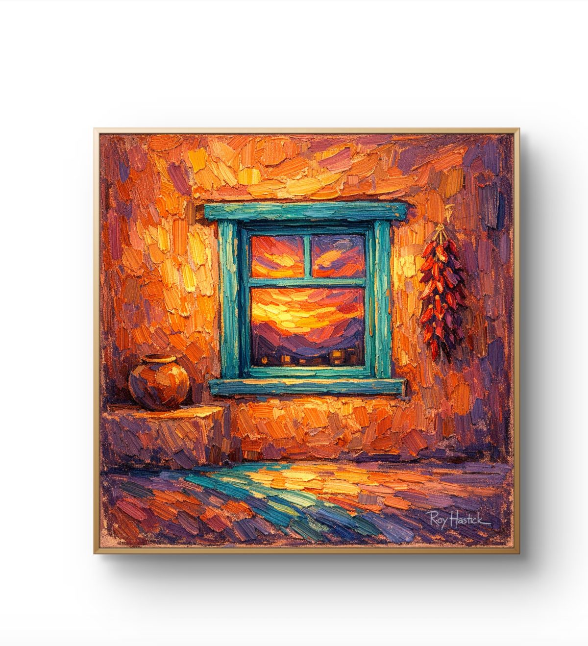 A richly textured oil painting depicting a Southwestern adobe wall with a turquoise‑framed window opening onto a radiant sunset. Through the window, the sky glows in orange, gold, and violet, with distant rooftops silhouetted against the light. On the left, a clay pot rests on a ledge; on the right, a string of red chili peppers hangs, adding warmth and local character. The brushwork is thick and expressive, emphasizing tactile surface and luminous color transitions. The piece is presented in a modern dark‑brown frame with a white mat, balancing contemporary simplicity with regional authenticity. Signed “Roy Hastick” in the lower right corner.