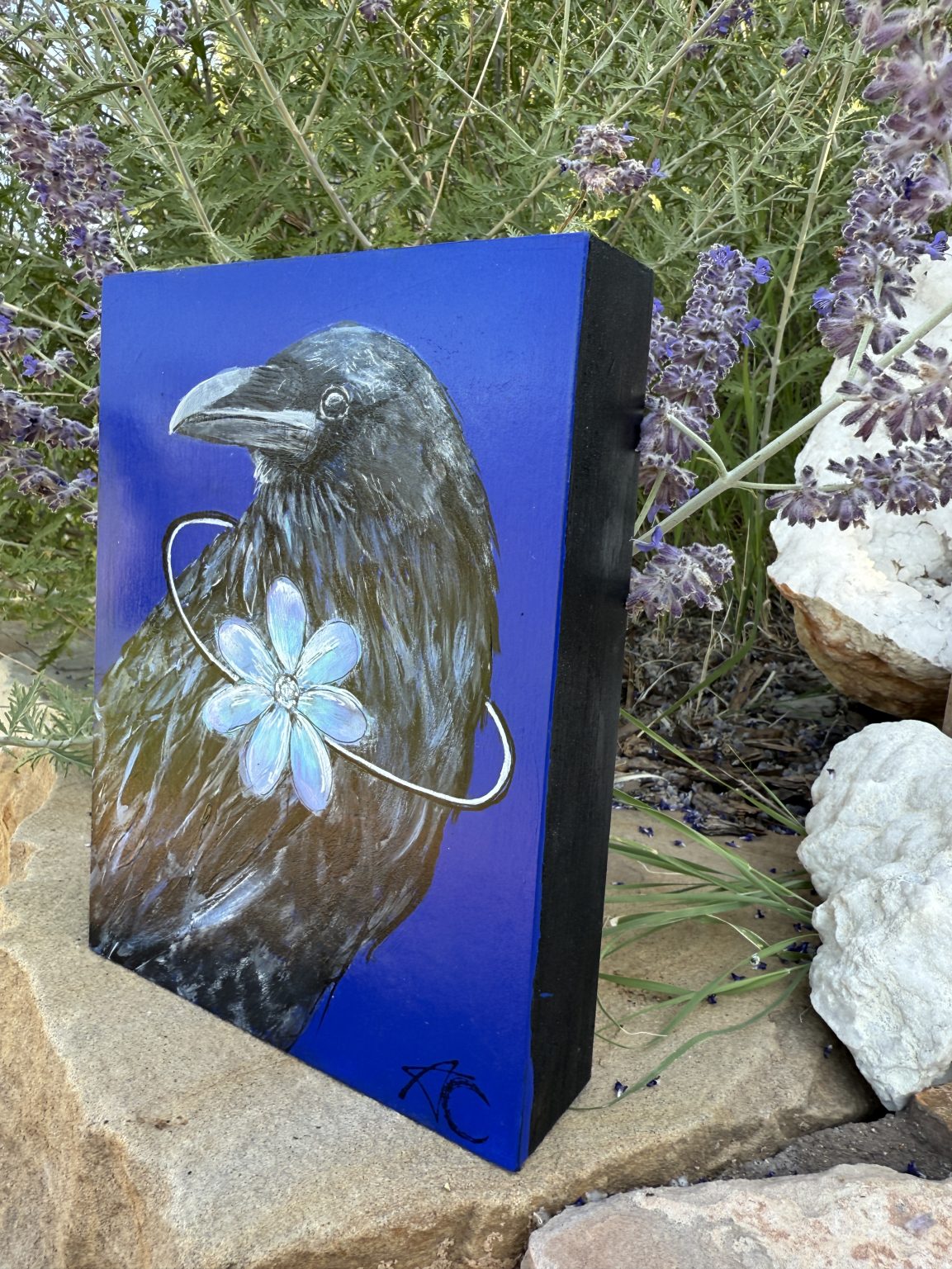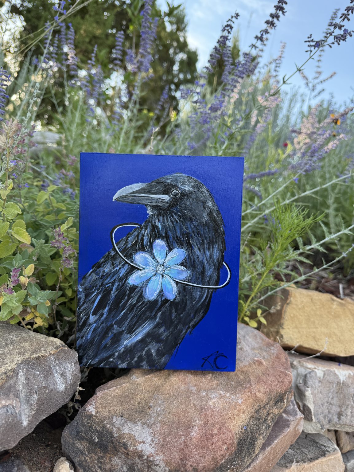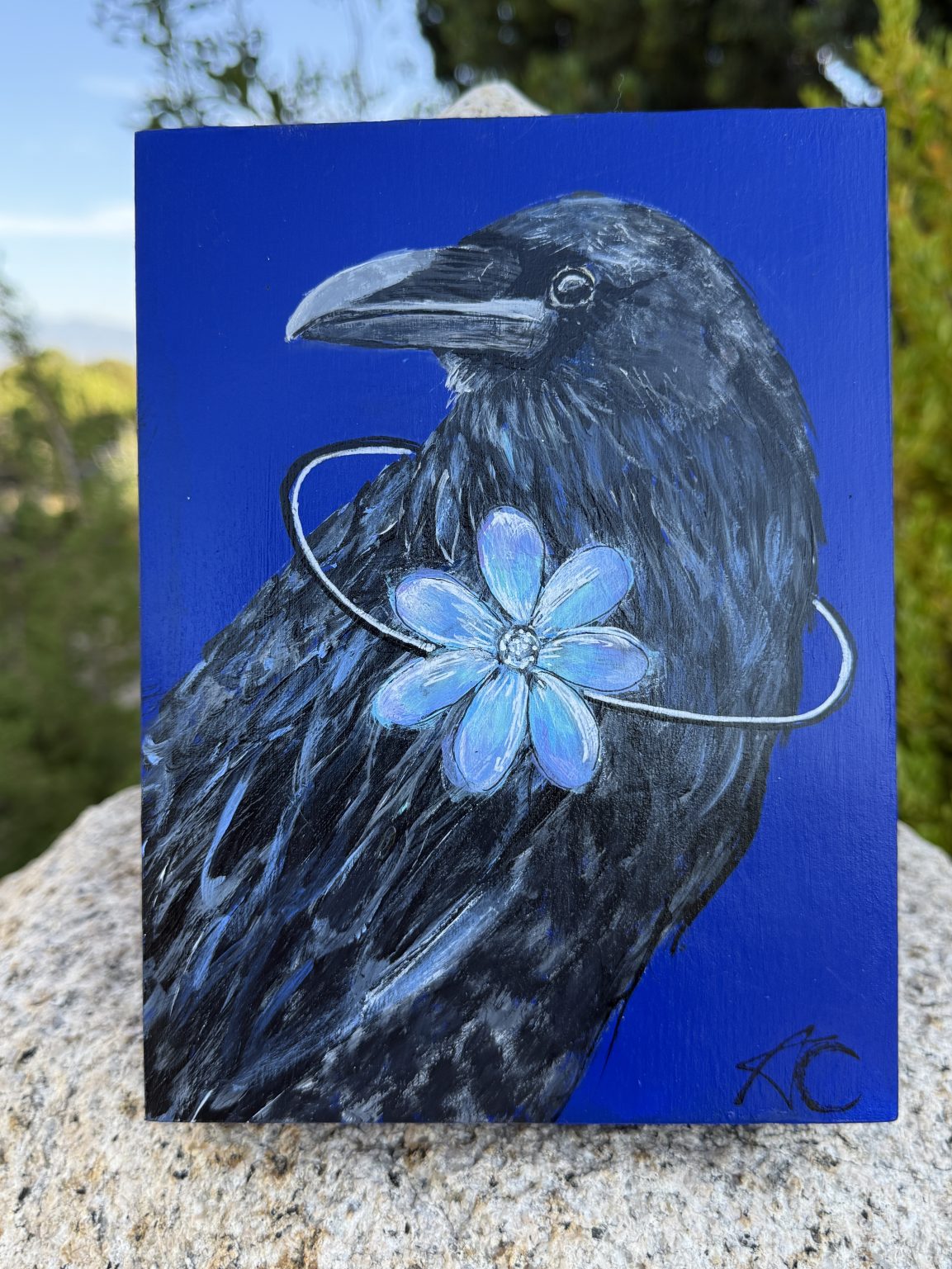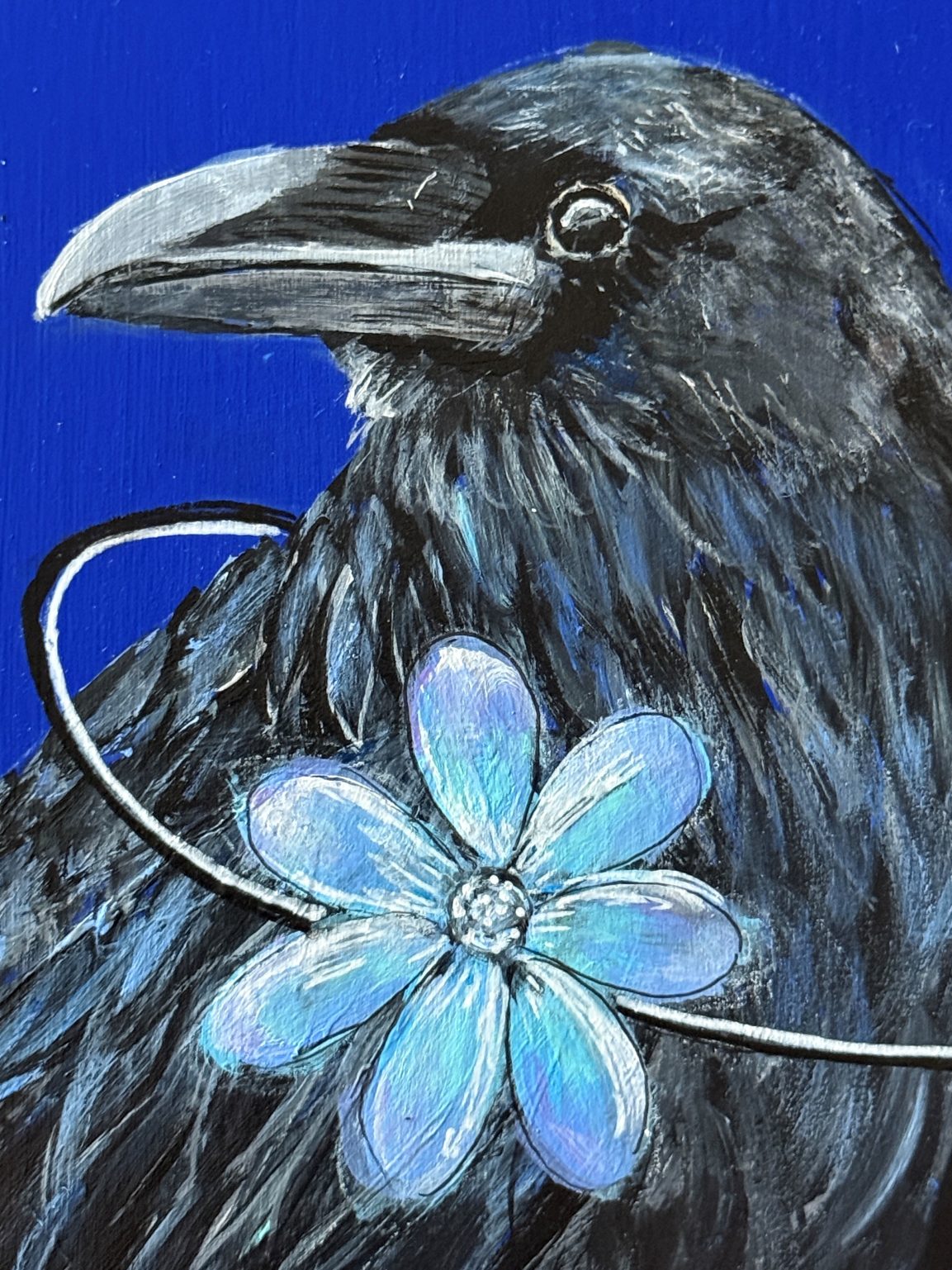 The inspiration for Clarity came from the ravens that often circle near my studio and come to drink from my fountains, their dark wings flashing iridescent blues in the sunlight. They seem to see the world differently — sharp, perceptive, and always present. I painted this piece as a reflection of that kind of vision: the beauty of truth seen clearly, unclouded by fear or doubt.