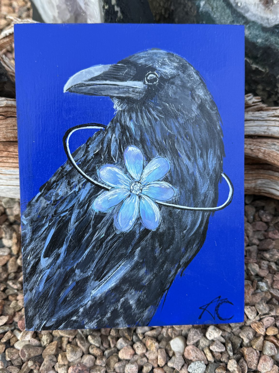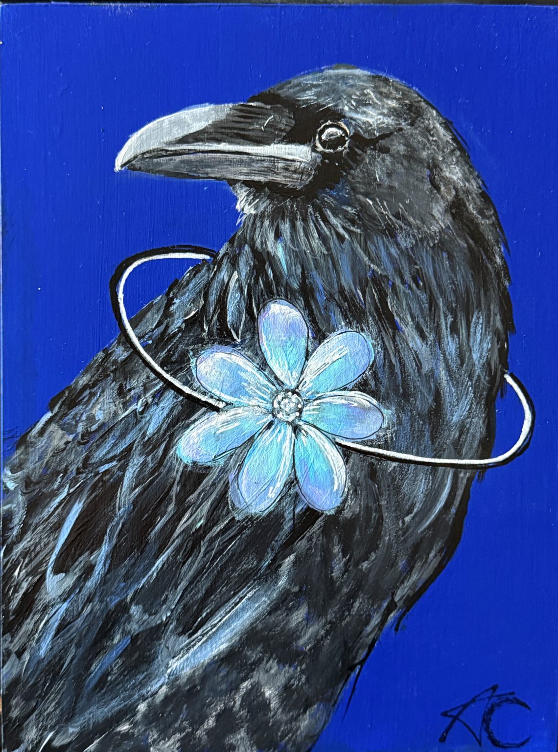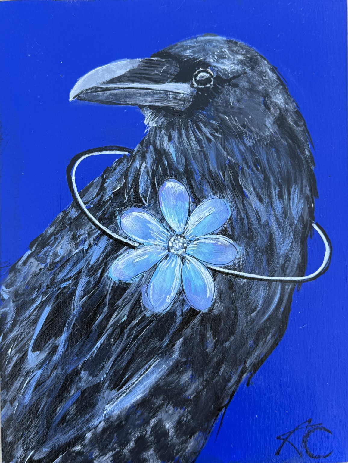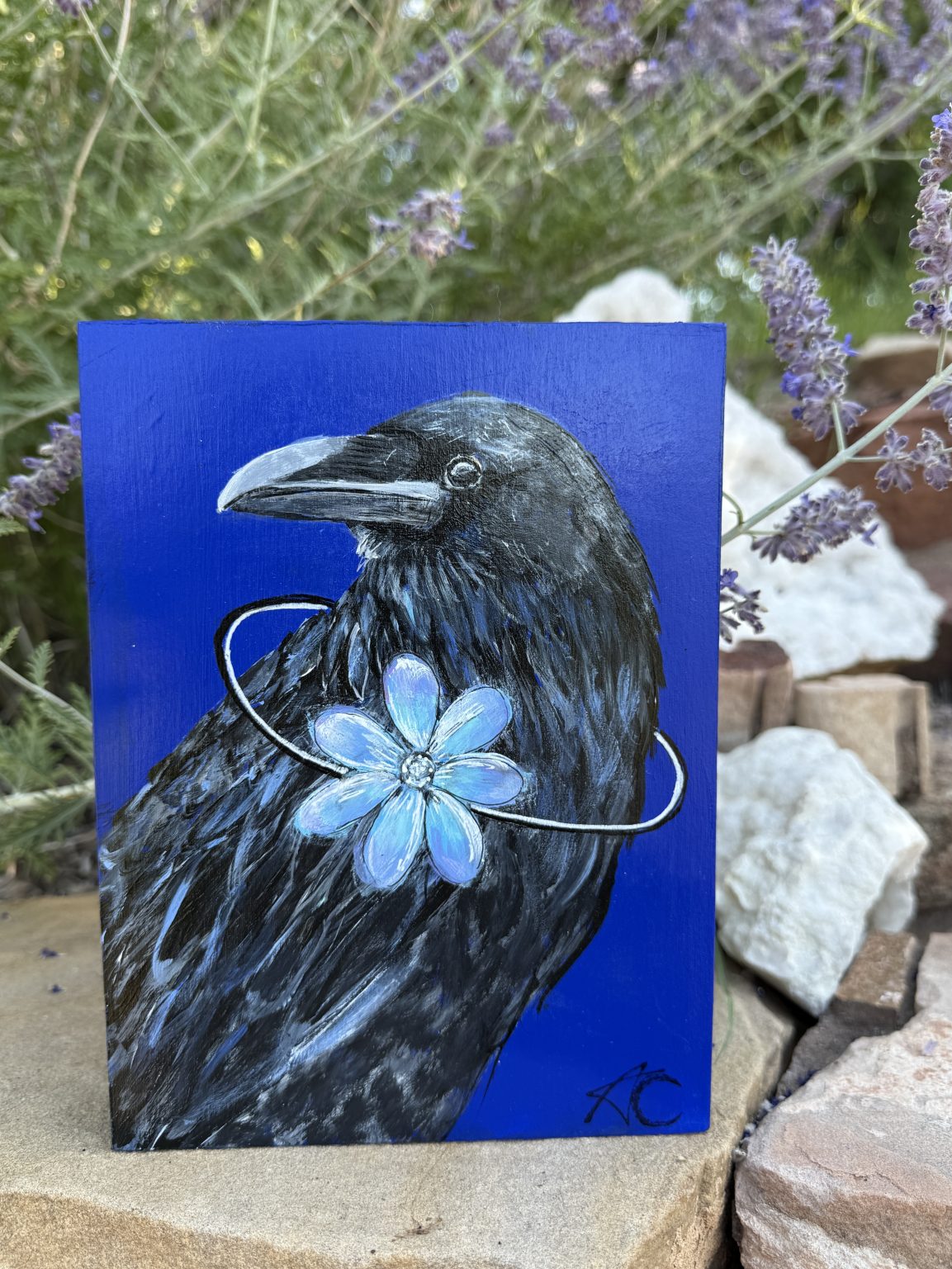 The inspiration for Clarity came from the ravens that often circle near my studio and come to drink from my fountains, their dark wings flashing iridescent blues in the sunlight. They seem to see the world differently — sharp, perceptive, and always present. I painted this piece as a reflection of that kind of vision: the beauty of truth seen clearly, unclouded by fear or doubt.
