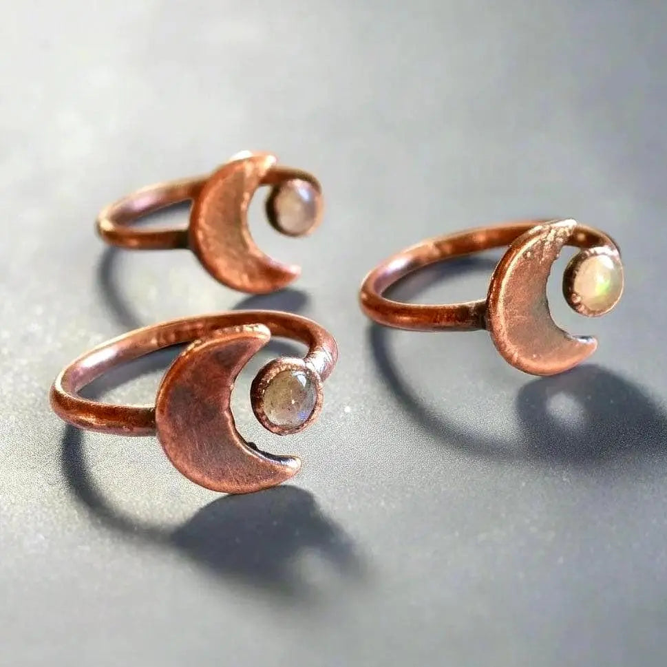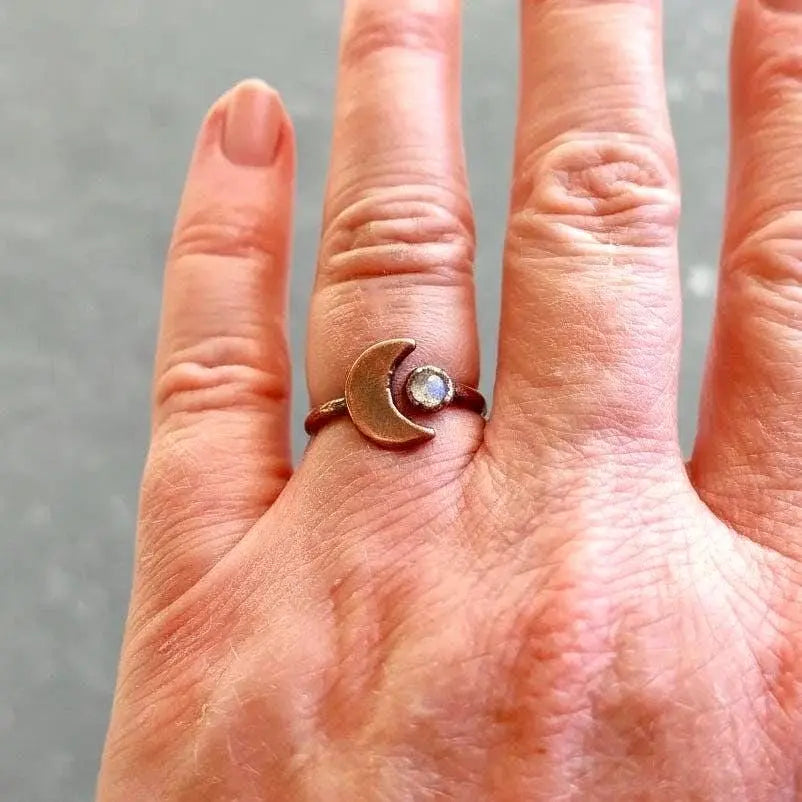 Handcrafted in copper with a luminous labradorite, this moon ring is a tactile talisman that grounds intuition and invites quiet clarity for your daily ritual adornment.