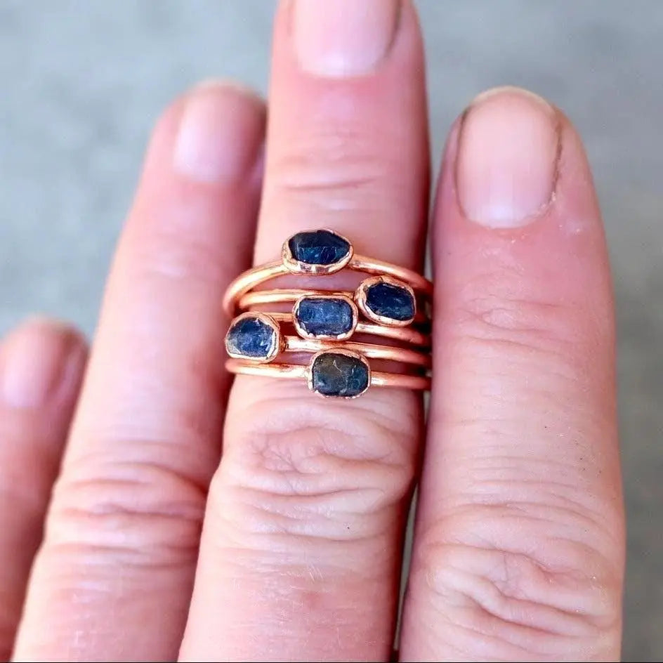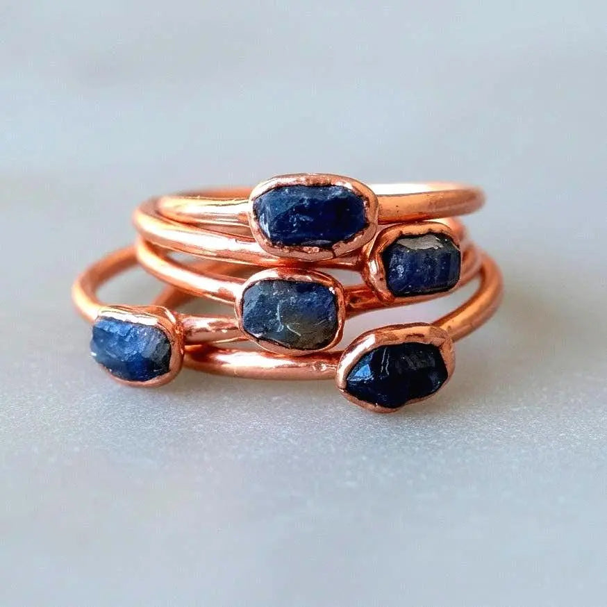 Sapphire is a very durable stone (second only to diamond in hardness), but treat this handcrafted ring gently. The copper will develop a beautiful living patina over time—polish with a soft cloth if you prefer brightness. Cleanse energetically by placing in moonlight or sunlight, on selenite, or with sage smoke. Sapphire is a stone of wisdom and clarity, so cleanse your sapphire ring regularly to maintain its clear, insightful energy.