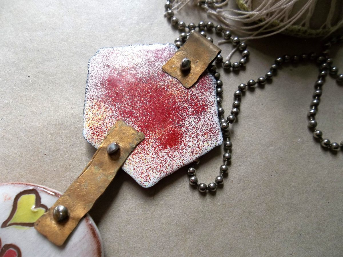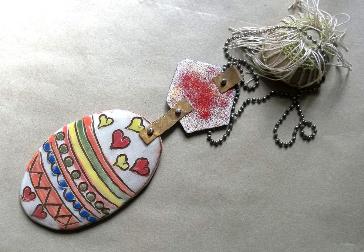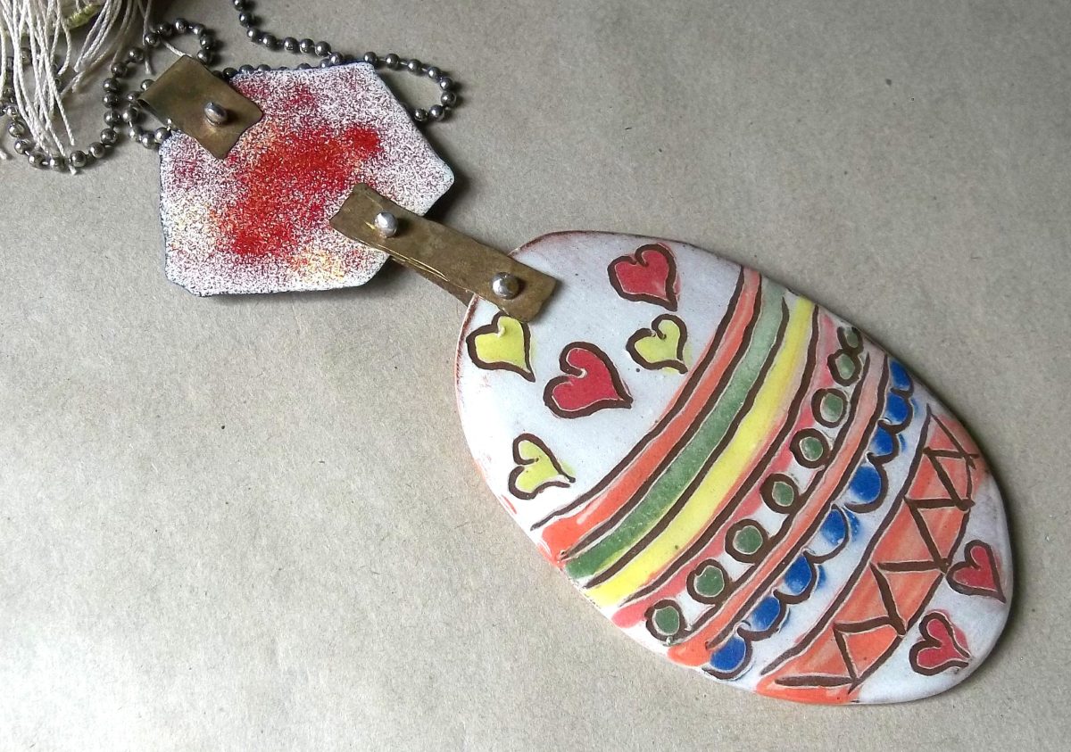 Large ceramic easter egg and artisan enamels on recycled copper with brass connectors. These components lend themselves to a fabulous neckpiece. Ball and chain necklace.