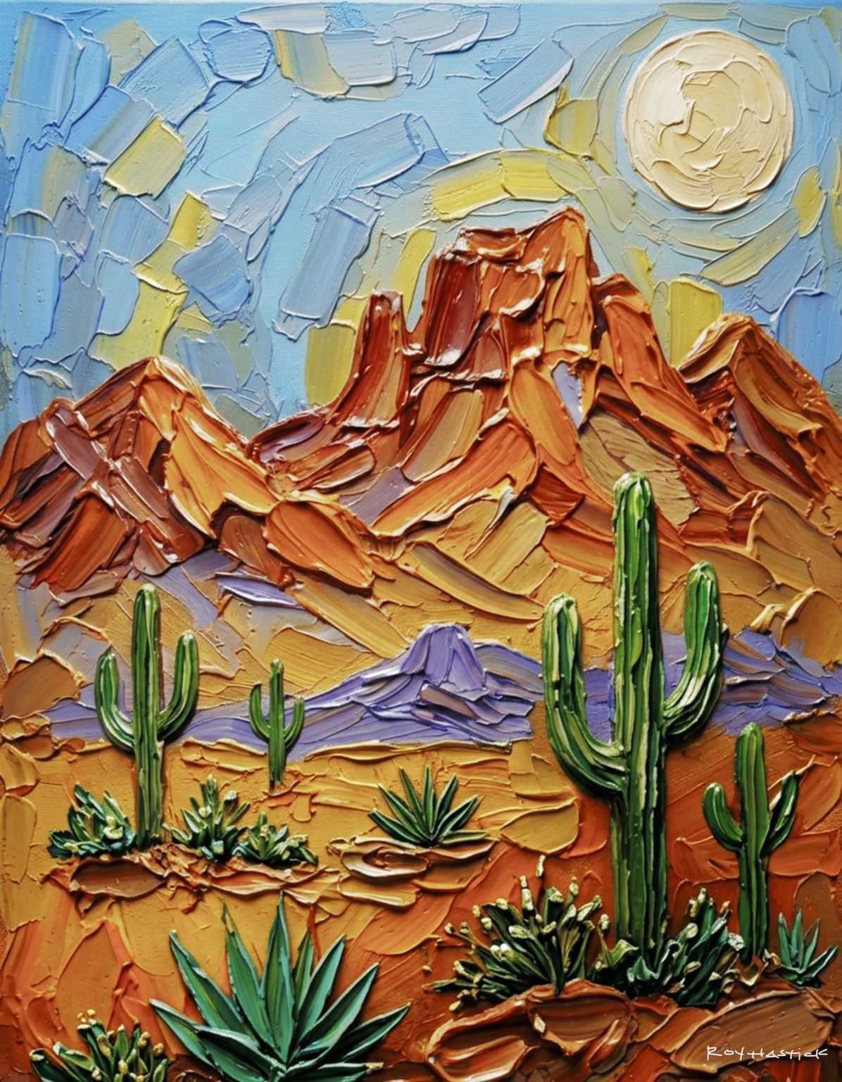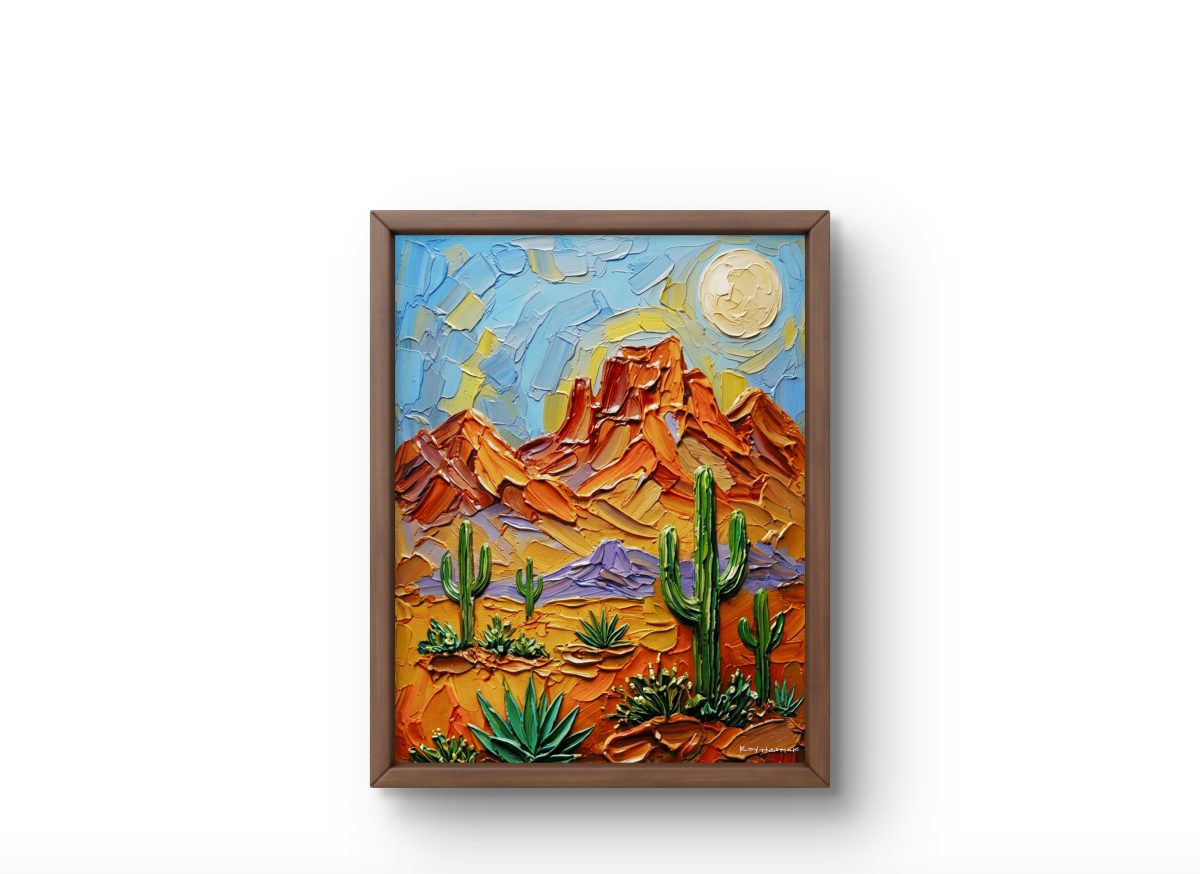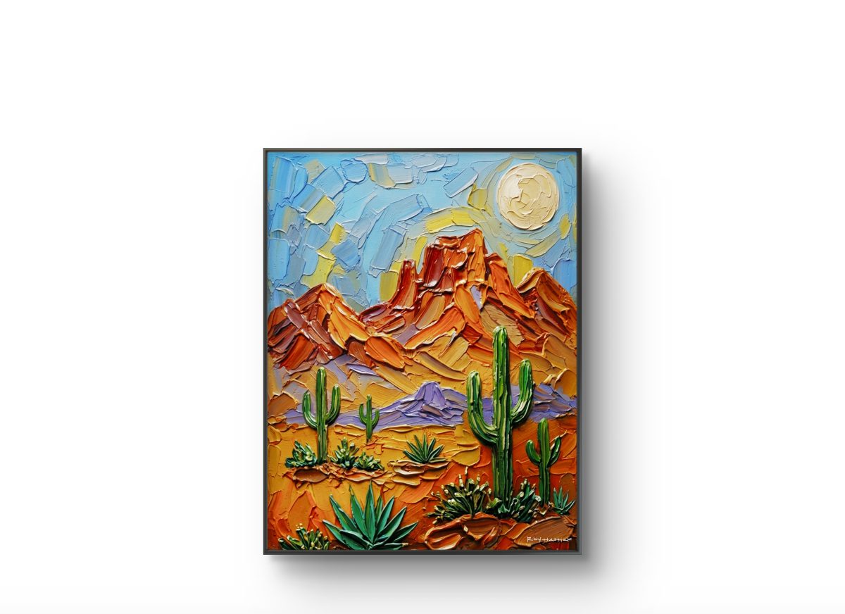 Capturing the soulful energy of the Northern New Mexico and Arizona corridors, this piece brings the rugged beauty of the desert into a modern light. The thick, sculptural application of paint—reminiscent of the “MINI” style—creates a physical presence on the canvas that shifts as the light in your room changes throughout the day.