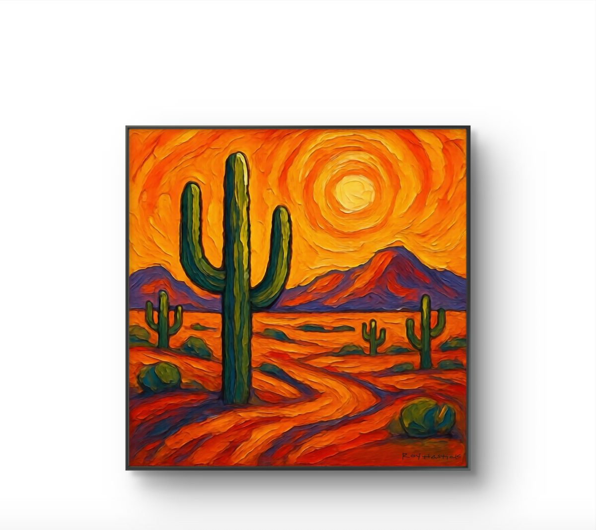 This painting is a vibrant, stylized interpretation of a desert landscape at midday. A prominent saguaro cactus stands in the foreground to the left, its deep green hue contrasting sharply against an intense orange and yellow sky. A winding path or dry wash leads the eye from the bottom of the frame toward a distant mountain range rendered in deep purples and reds.