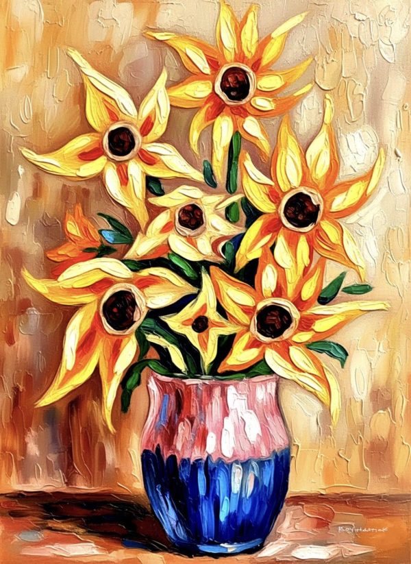This stylized still life features a bouquet of highly abstracted, yellow and gold star-like flowers, resembling sunflowers or black-eyed Susans, presented in a vertically textured vase with a pink and deep blue base. The background maintains a warm, muted palette with visible, vertical impasto strokes. The artwork transforms a simple floral arrangement into an energetic and expressive study of form and texture, characteristic of Vibrant Lyrical Abstract Expressionism and the style of Roy Hastick.