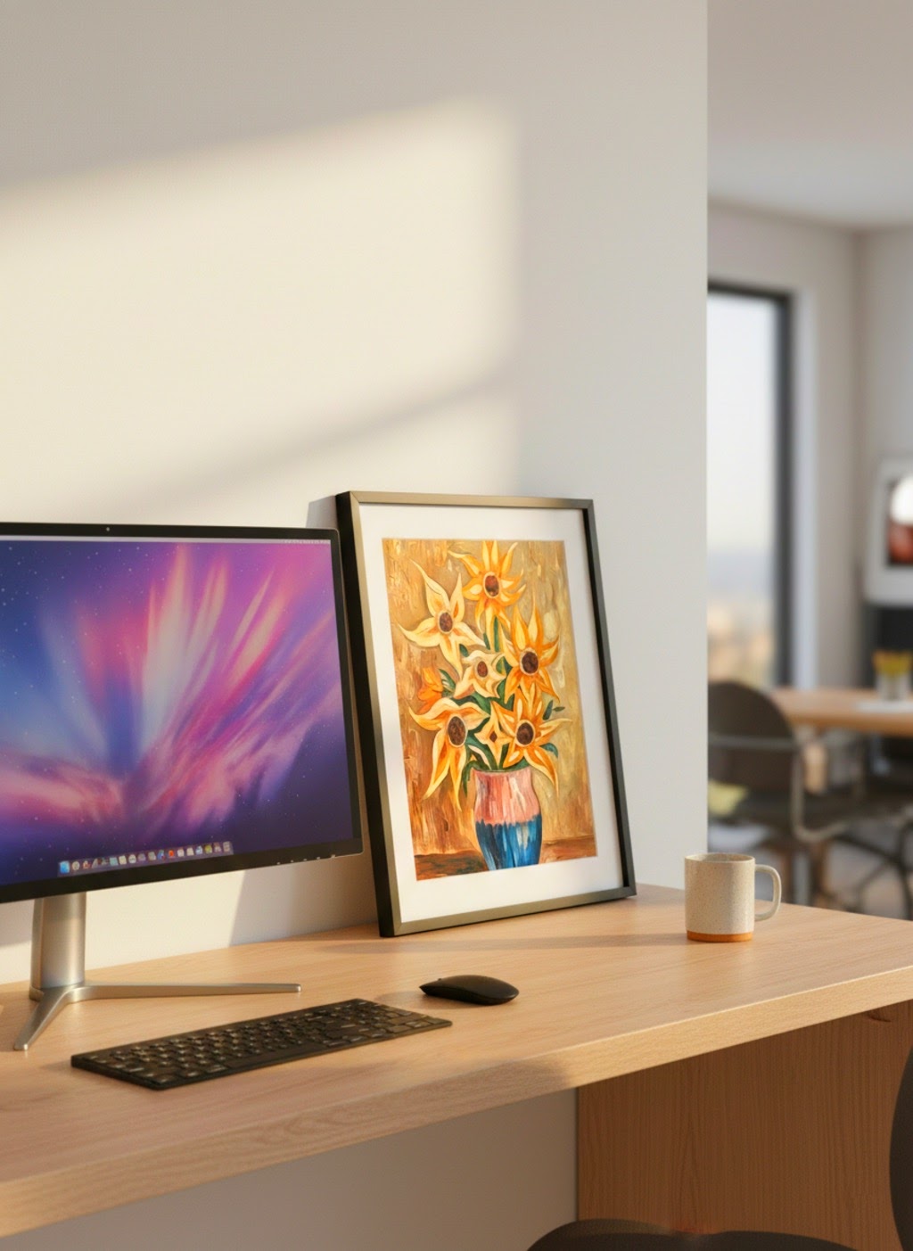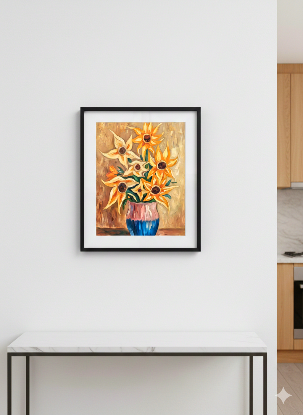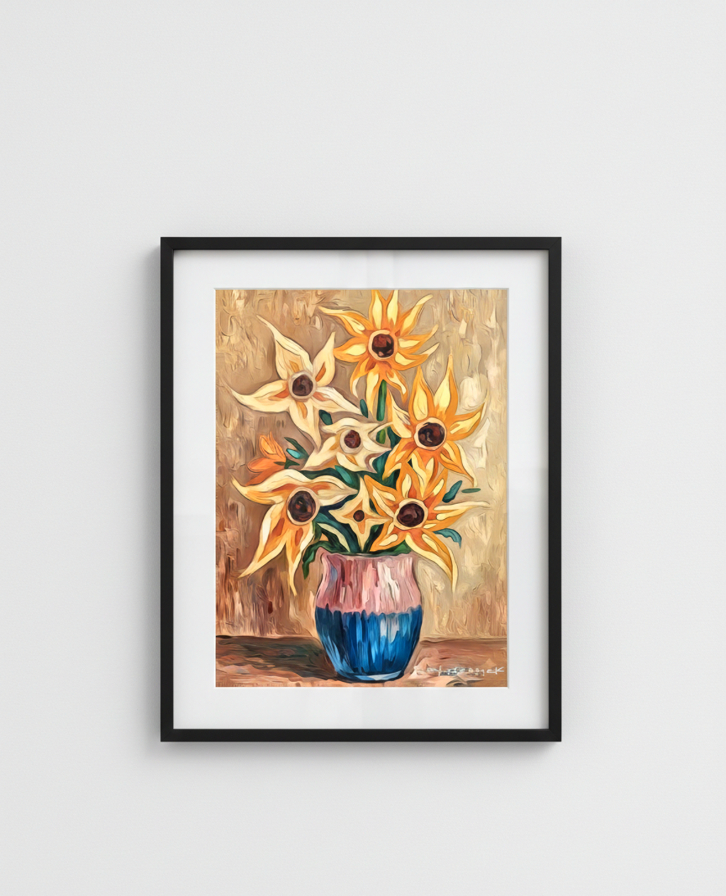 This stylized still life features a bouquet of highly abstracted, yellow and gold star-like flowers, resembling sunflowers or black-eyed Susans, presented in a vertically textured vase with a pink and deep blue base. The background maintains a warm, muted palette with visible, vertical impasto strokes. The artwork transforms a simple floral arrangement into an energetic and expressive study of form and texture, characteristic of Vibrant Lyrical Abstract Expressionism and the style of Roy Hastick.