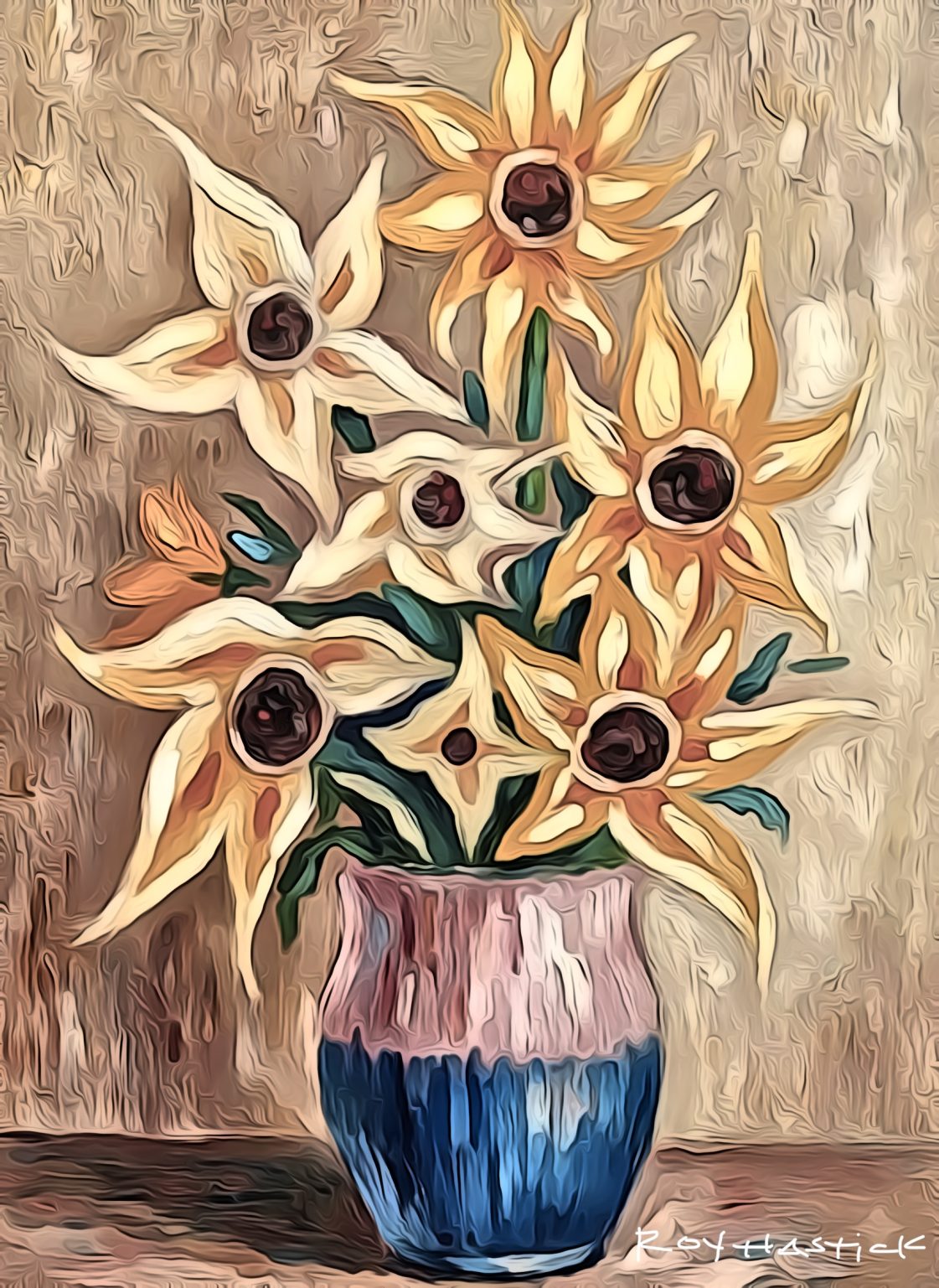 This stylized still life features a bouquet of highly abstracted, yellow and gold star-like flowers, resembling sunflowers or black-eyed Susans, presented in a vertically textured vase with a pink and deep blue base. The background maintains a warm, muted palette with visible, vertical impasto strokes. The artwork transforms a simple floral arrangement into an energetic and expressive study of form and texture, characteristic of Vibrant Lyrical Abstract Expressionism and the style of Roy Hastick.