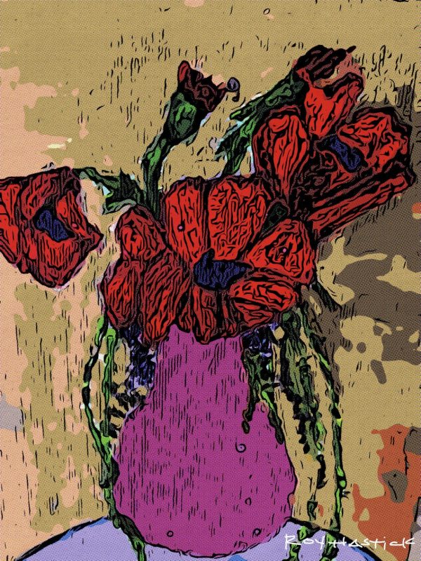 This vivid painting marks the beginning of a larger collection; it is the inaugural rose that sparked the creative journey. Rendered in a bold, expressionistic style (similar to the Vib.rant Lyrical Abstract Expressionism technique), the deep red blossoms burst from a stylized purple vessel. The artwork captures an initial energy and passion, celebrating the moment this rose became the source of artistic inspiration