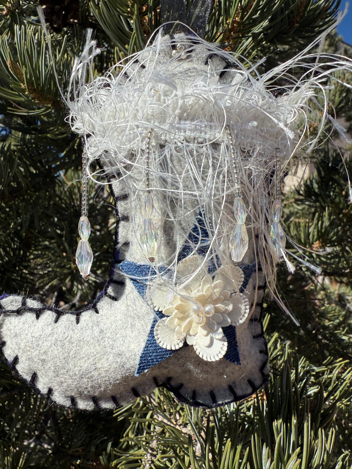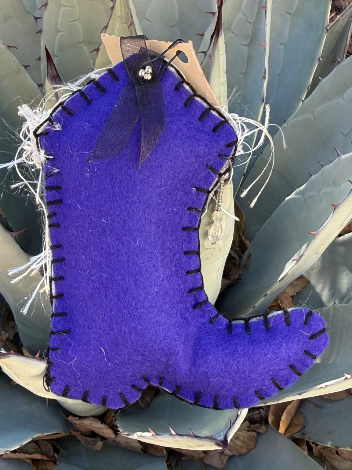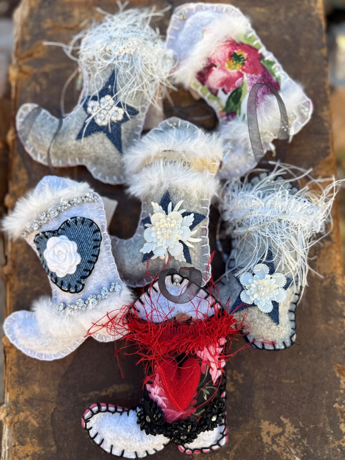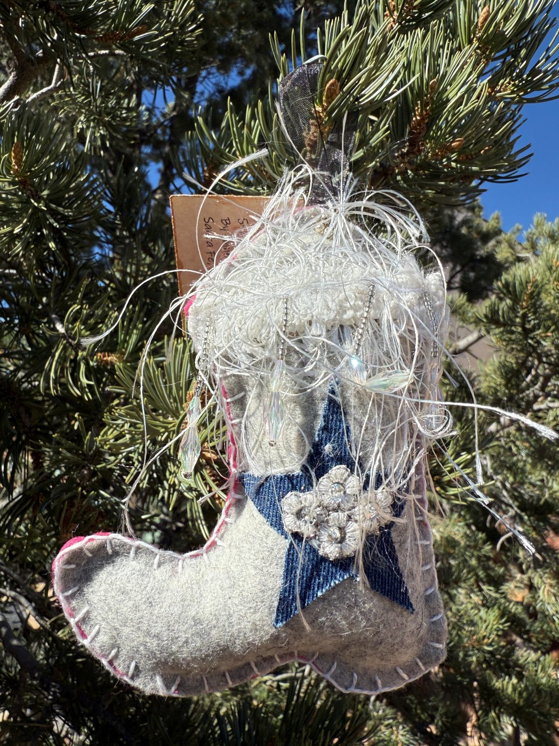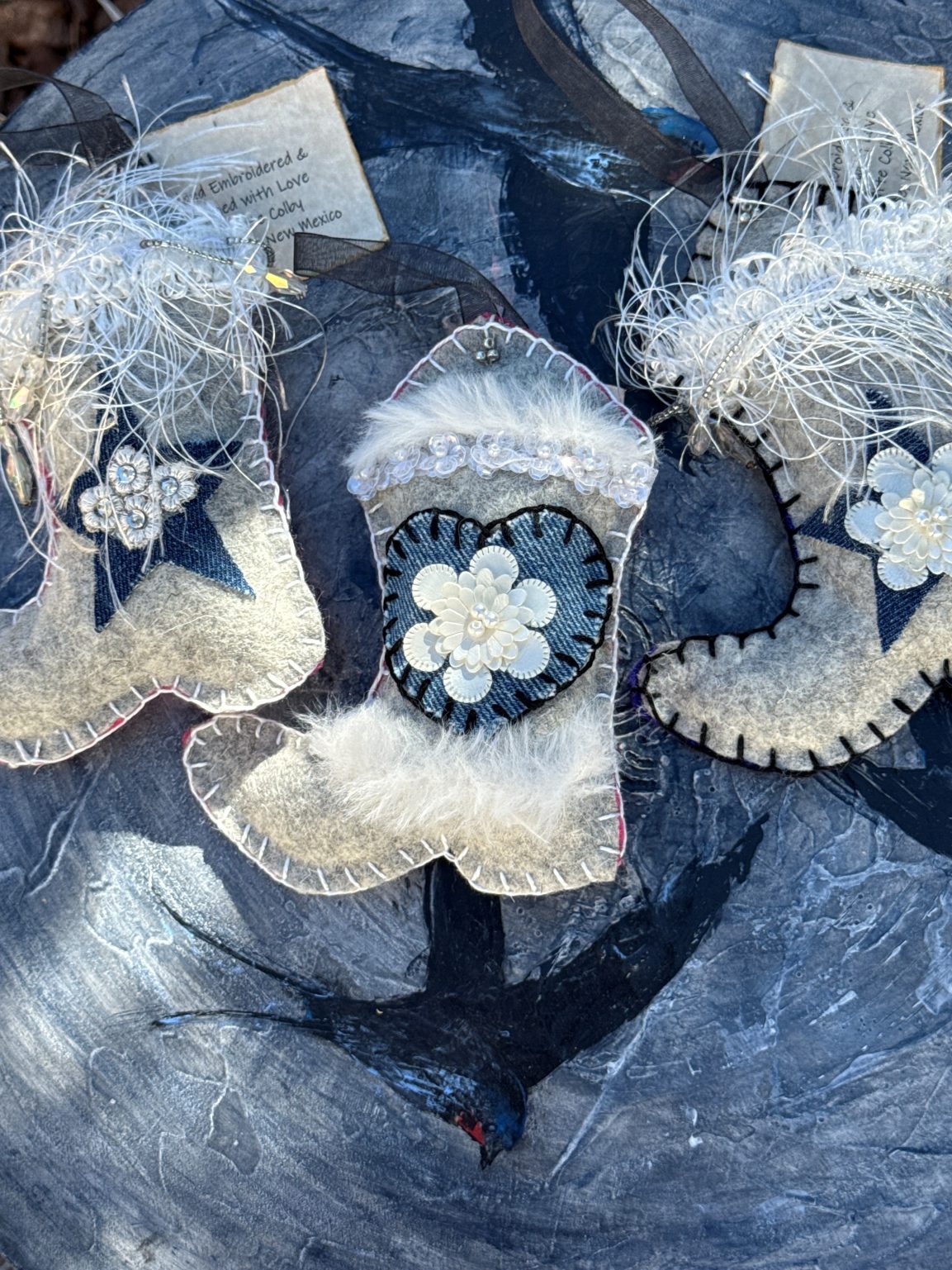 Created in my studio here in Santa Fe, every boot is hand-embroidered and finished with loving care. Stuffed with poly fiberfill, they have a soft dimensional feel that makes them irresistible to look at and hold. Whether hung on a holiday tree, displayed all year on a hook or shelf, or given as a sweet keepsake — each boot carries western spirit, enchantment, and a touch of delight.