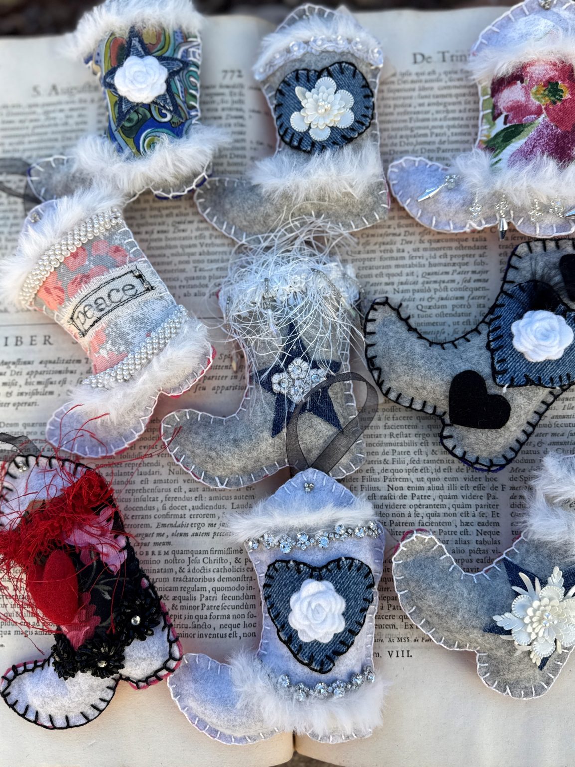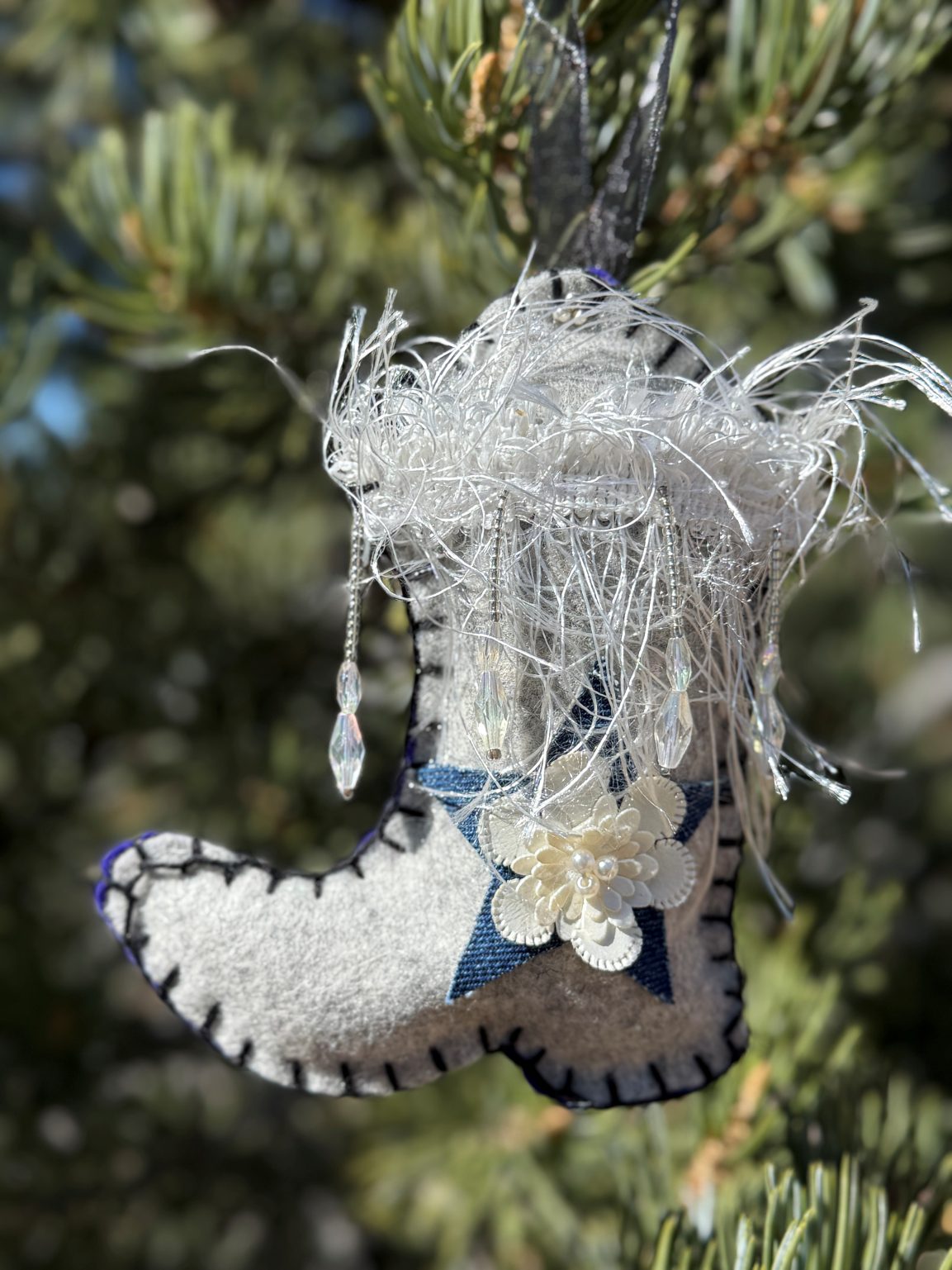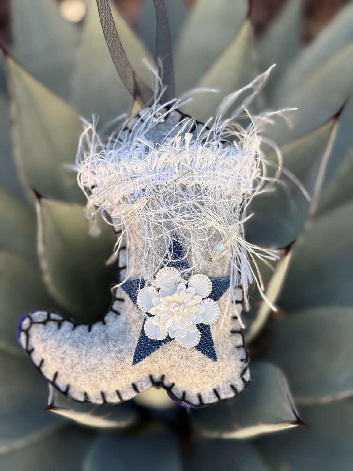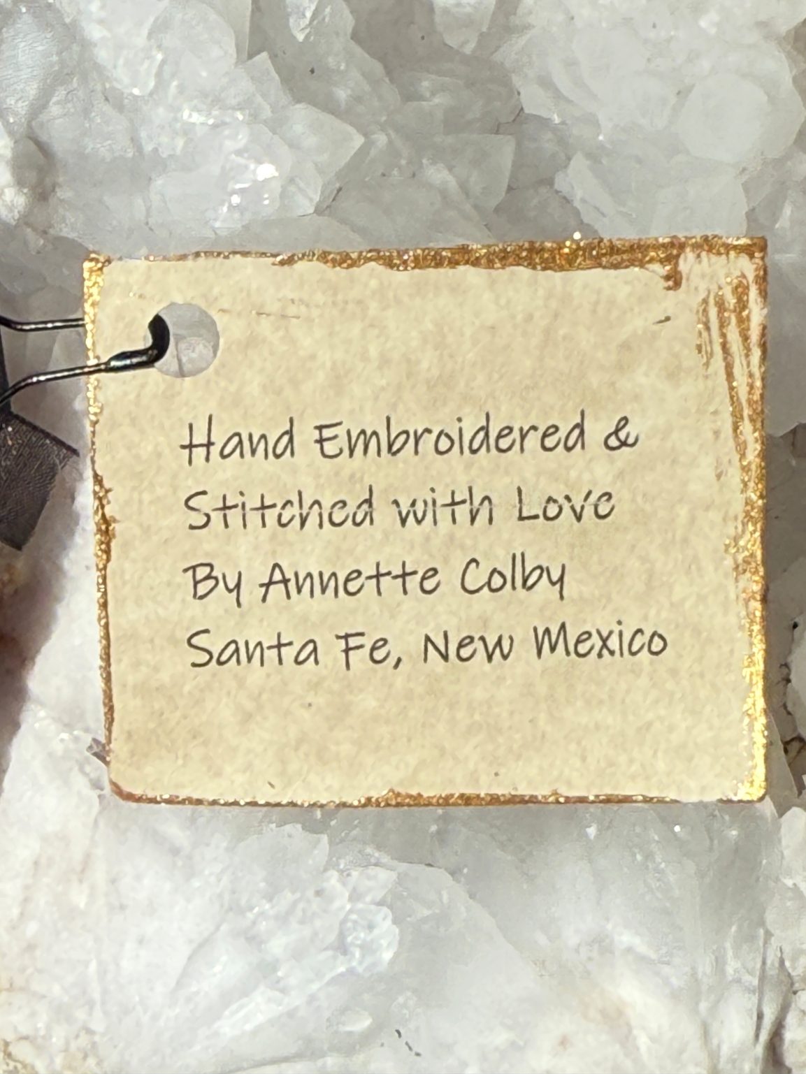 Created in my studio here in Santa Fe, every boot is hand-embroidered and finished with loving care. Stuffed with poly fiberfill, they have a soft dimensional feel that makes them irresistible to look at and hold. Whether hung on a holiday tree, displayed all year on a hook or shelf, or given as a sweet keepsake — each boot carries western spirit, enchantment, and a touch of delight.