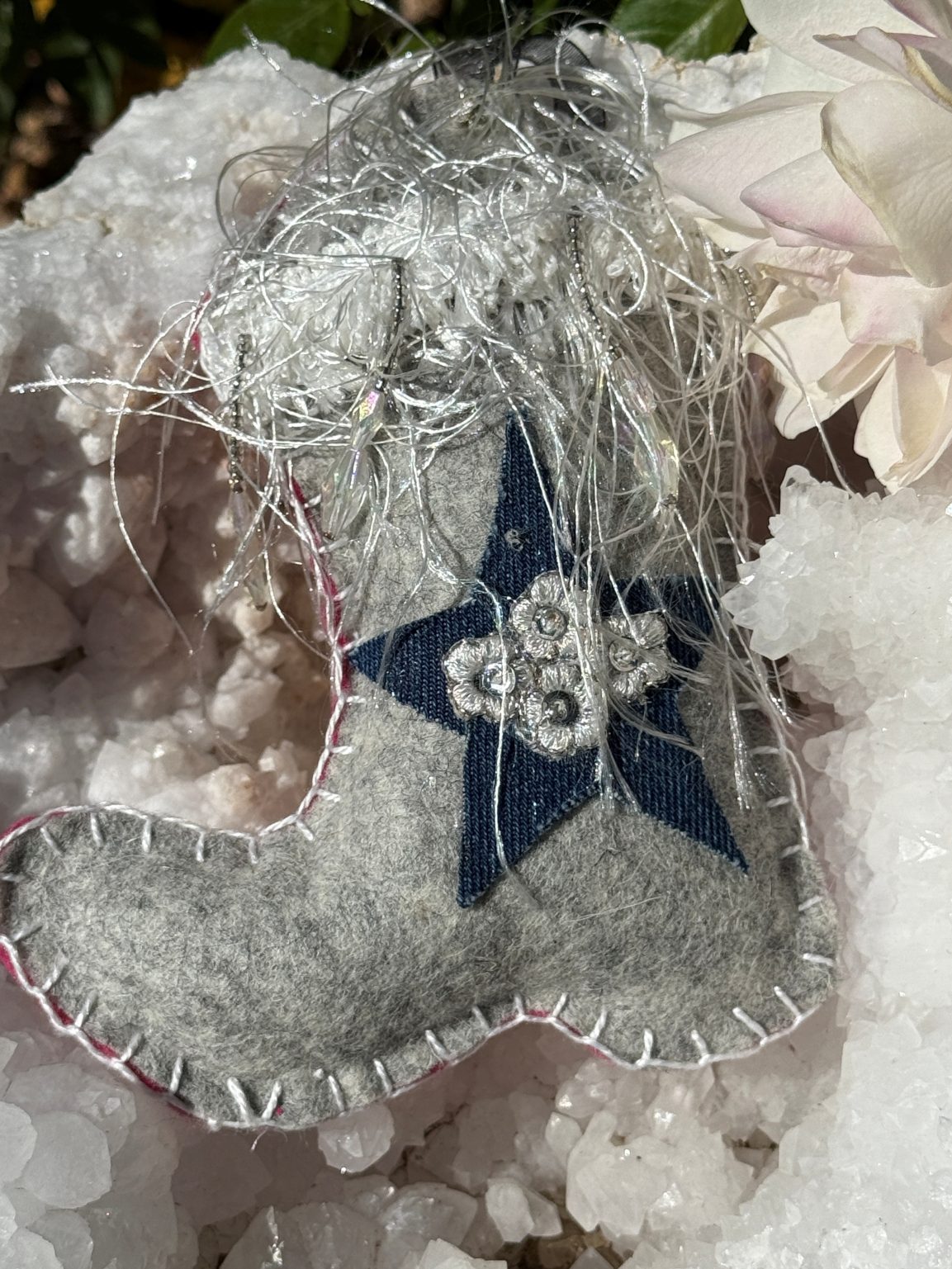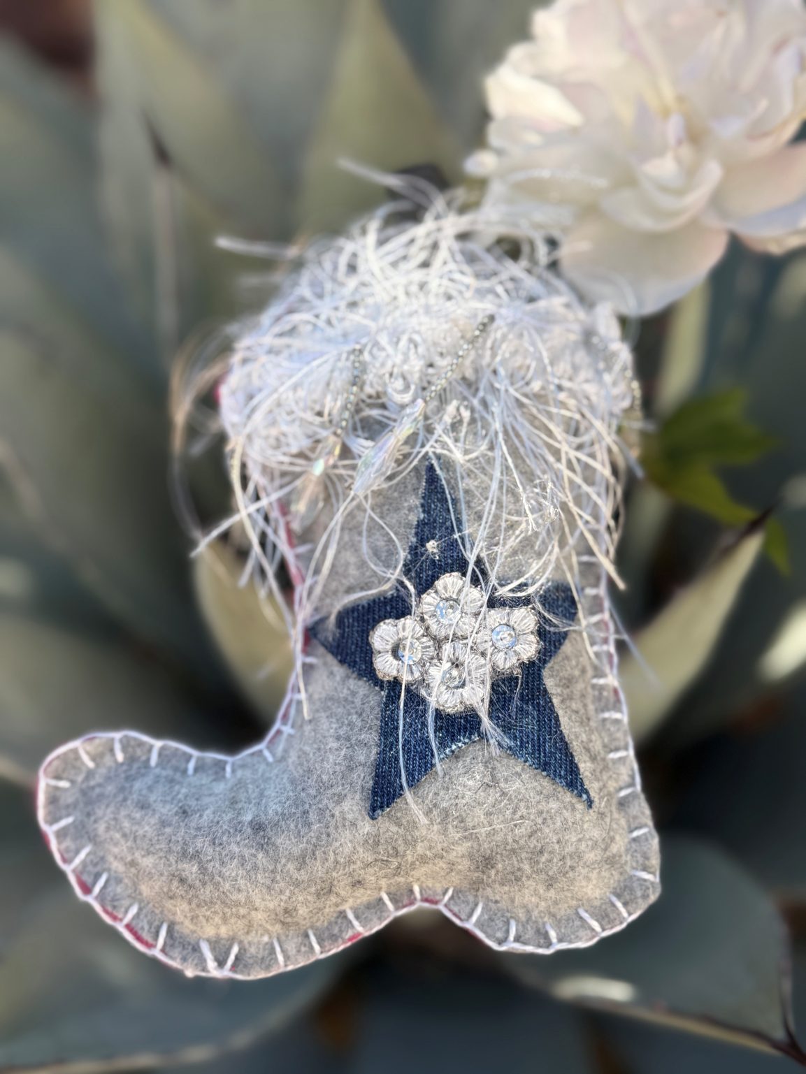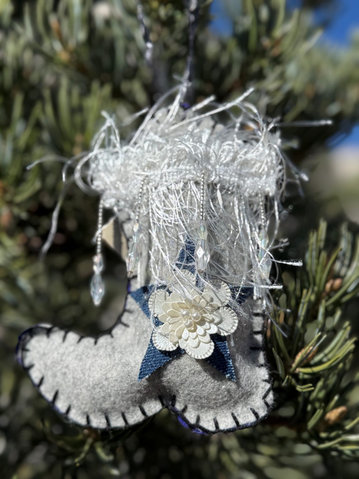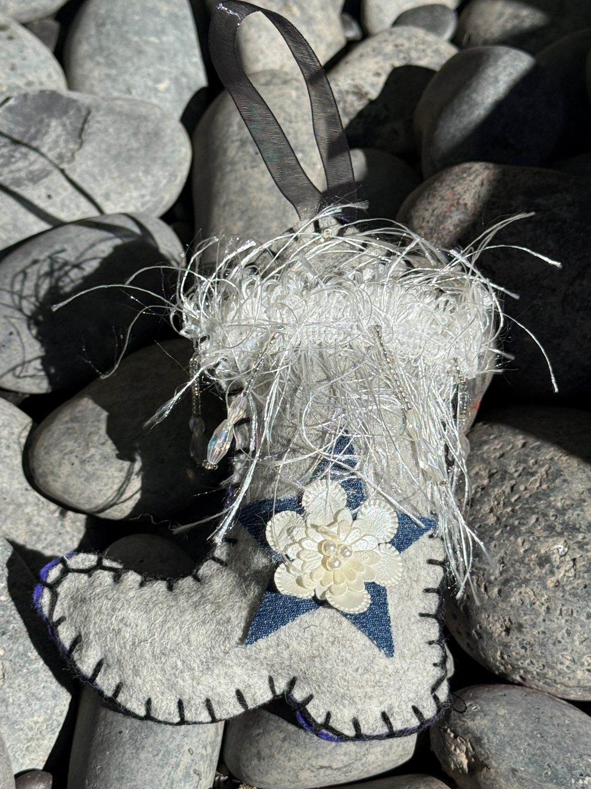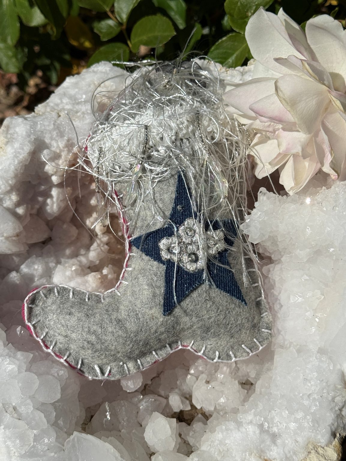 Created in my studio here in Santa Fe, every boot is hand-embroidered and finished with loving care. Stuffed with poly fiberfill, they have a soft dimensional feel that makes them irresistible to look at and hold. Whether hung on a holiday tree, displayed all year on a hook or shelf, or given as a sweet keepsake — each boot carries western spirit, enchantment, and a touch of delight.