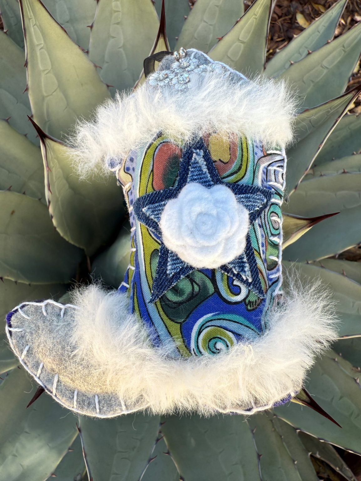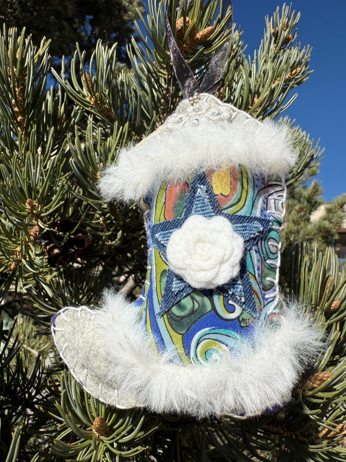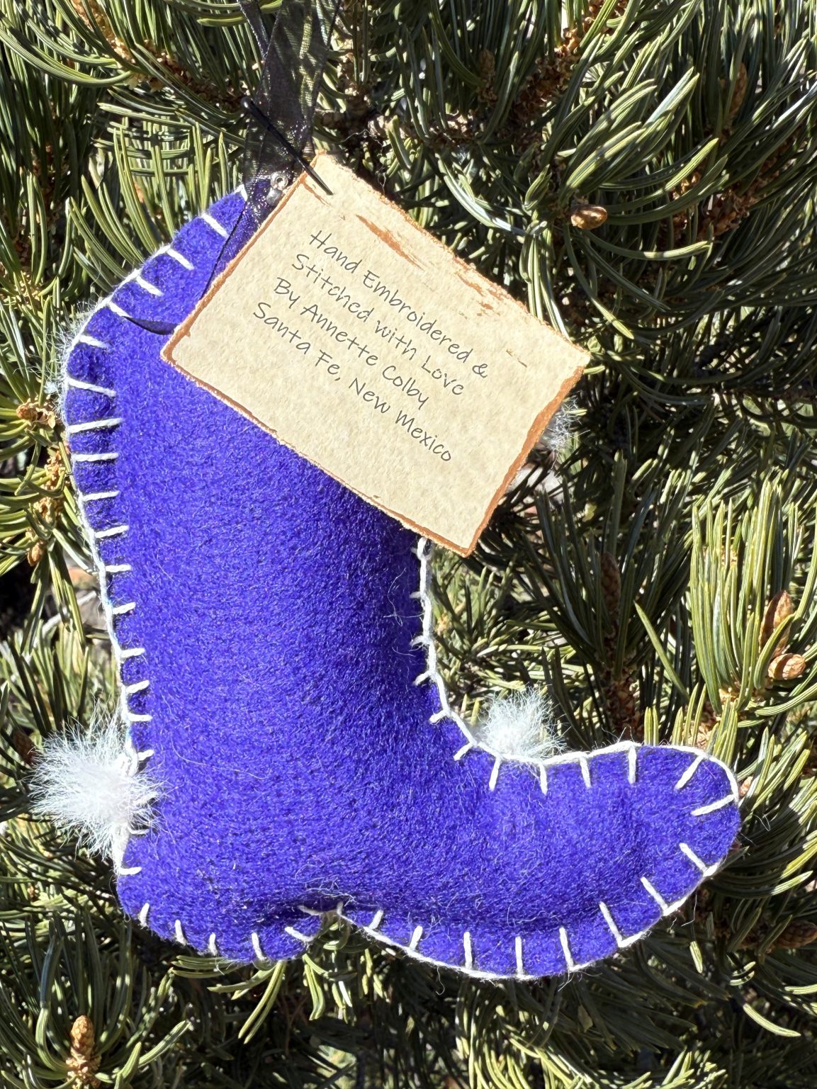 Created in my studio here in Santa Fe, every boot is hand-embroidered and finished with loving care. Stuffed with poly fiberfill, they have a soft dimensional feel that makes them irresistible to look at and hold. Whether hung on a holiday tree, displayed all year on a hook or shelf, or given as a sweet keepsake — each boot carries western spirit, enchantment, and a touch of delight.