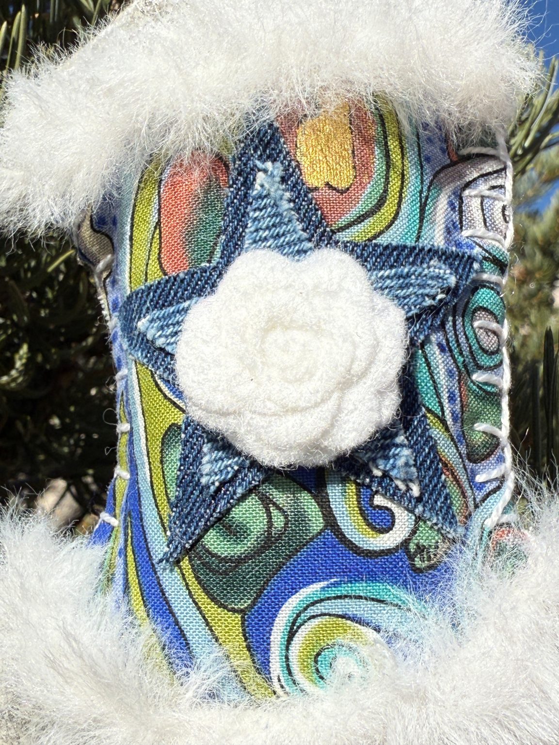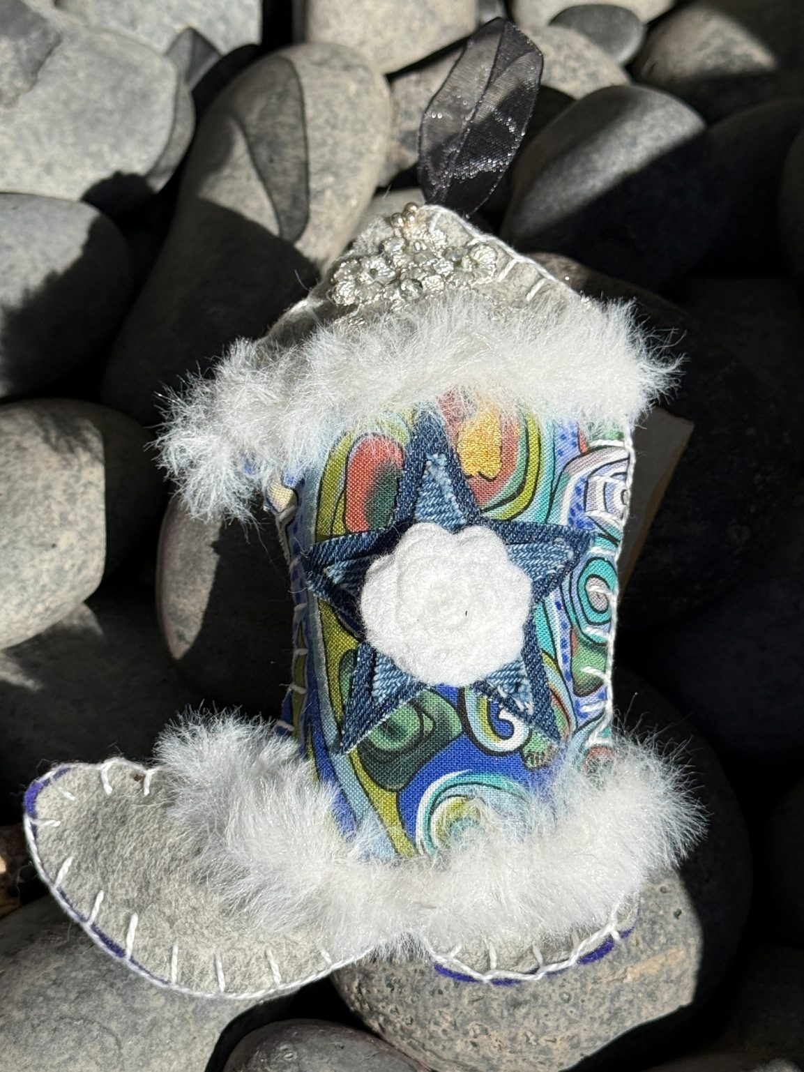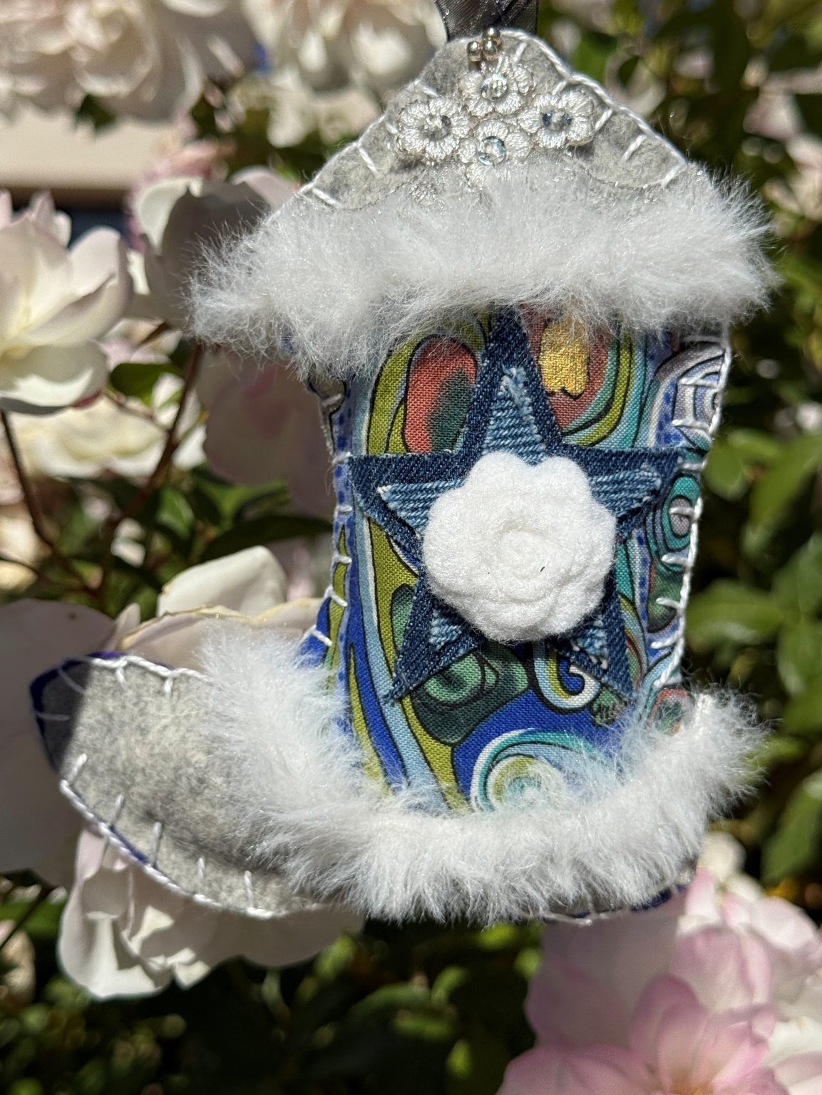 Created in my studio here in Santa Fe, every boot is hand-embroidered and finished with loving care. Stuffed with poly fiberfill, they have a soft dimensional feel that makes them irresistible to look at and hold. Whether hung on a holiday tree, displayed all year on a hook or shelf, or given as a sweet keepsake — each boot carries western spirit, enchantment, and a touch of delight.