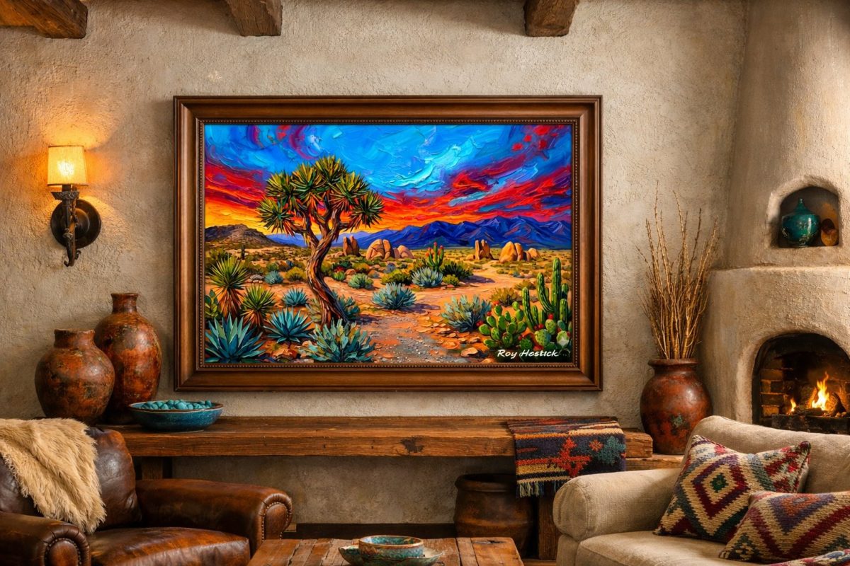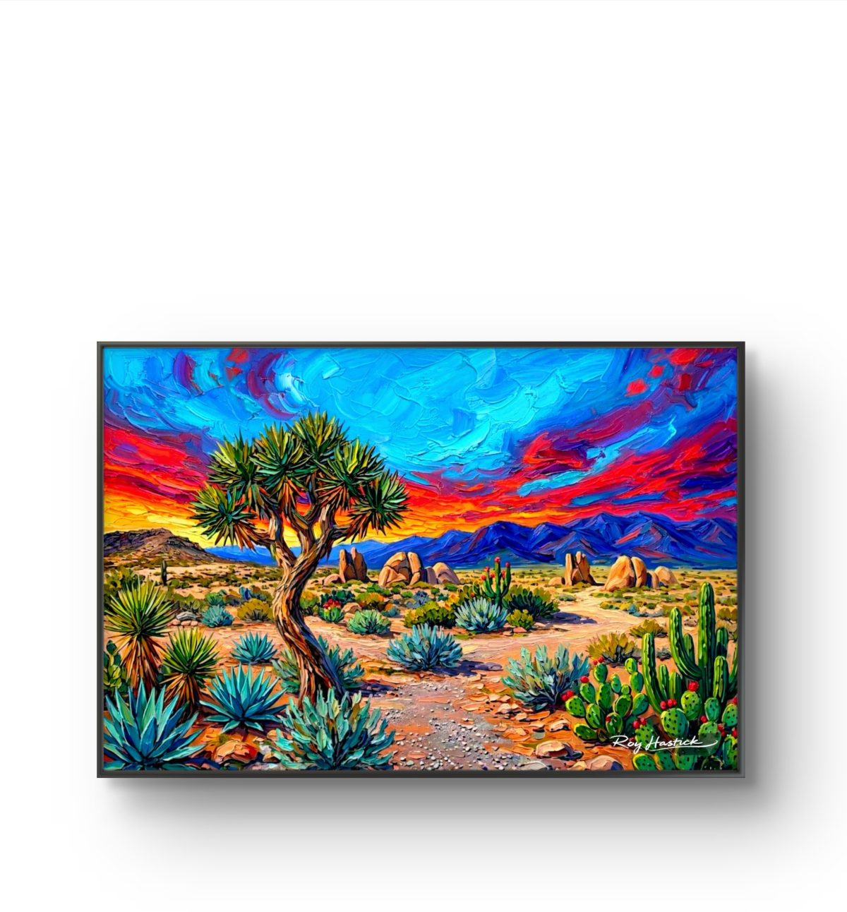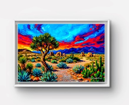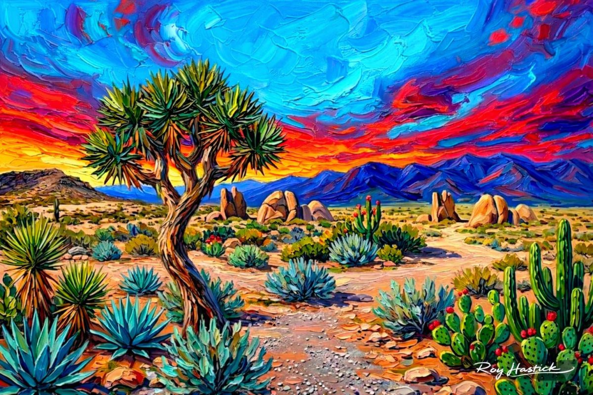 This piece captures a striking desert landscape with incredible textural depth. The application of the medium creates a “buttered” effect, with thick, sculpted ridges that give the sky and flora a three-dimensional quality. The contrast between the cool turquoise agaves and the fiery, sweeping reds of the horizon creates a high-energy atmosphere.