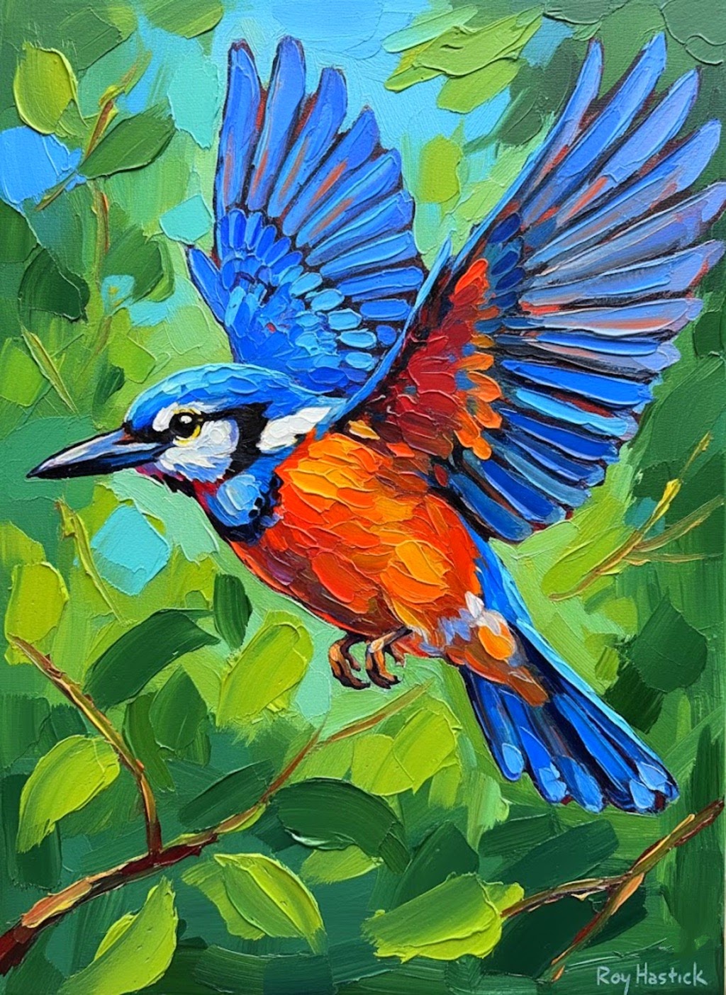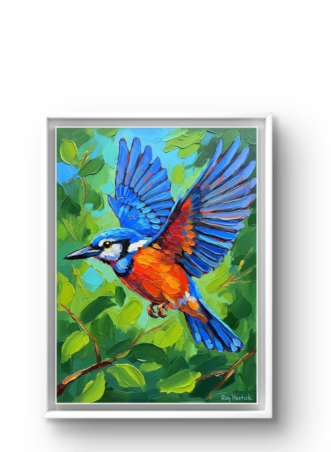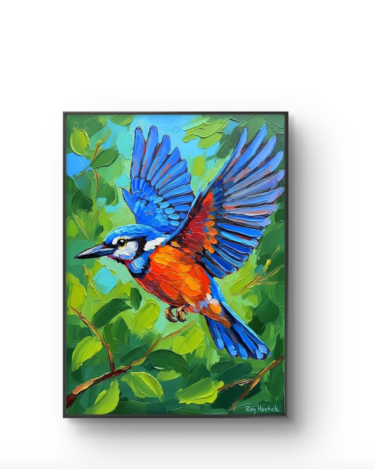 This vibrant piece is a masterclass in Vibrant Lyrical Abstract Expressionism, showcasing a kingfisher in mid-flight. The composition is defined by heavy, “buttered” impasto textures, where every stroke of the palette knife adds sculptural depth to the bird’s brilliant azure wings and fiery orange breast. Set against a lush, multi-tonal green background, the work captures the fleeting energy of nature with the unmistakable “Return of the Hand” tactile quality.
