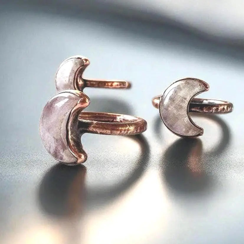 - Slow electroforming: copper is carefully grown around each raw kunzite crescent so the metal follows the stone’s natural contours, preserving its raw character and lunar silhouette.