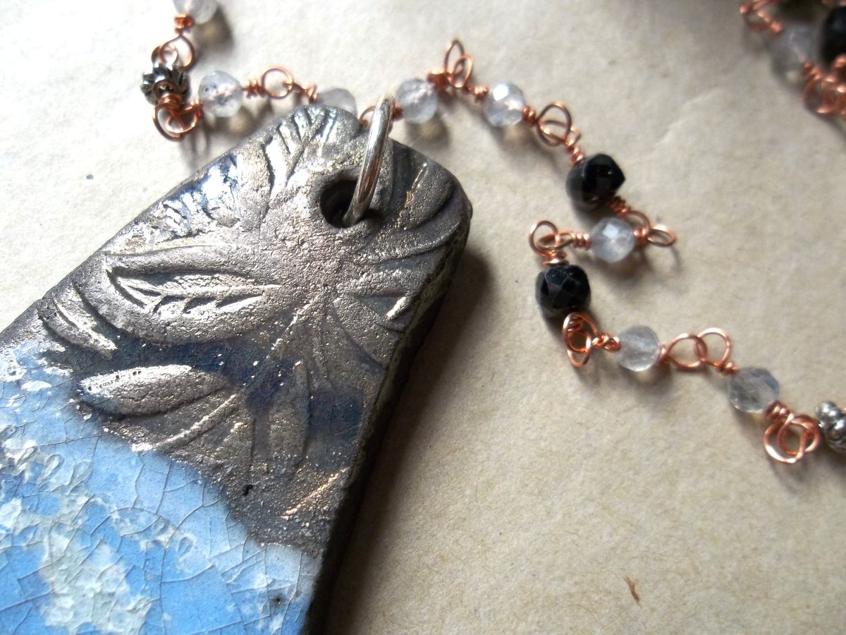 Large raku pendant and handmade chain of faceted labradorite and onyx beads on copper lends itself to a fabulous neckpiece. Just stunning.