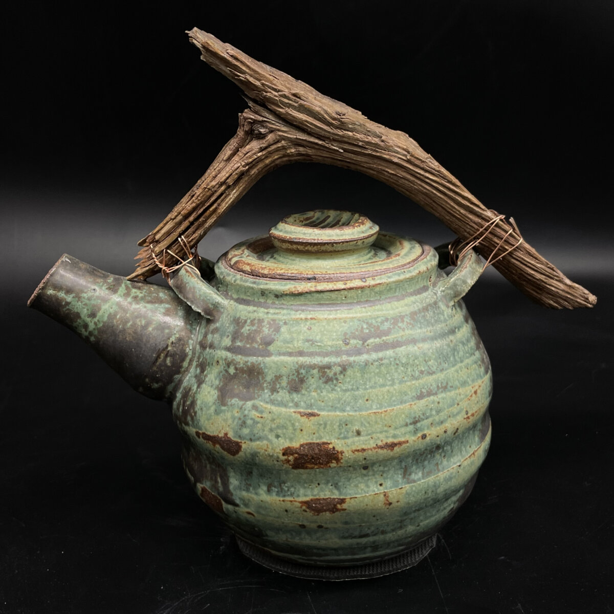 Sage Monsoon teapot handmade by Angela Smith Kirkman in Santa Fe, NM. Fired in a Cone 10 gas reduction. Handle is fashioned with found juniper. Holds 4 cups of tea and measures 8”H x 9”x 5”