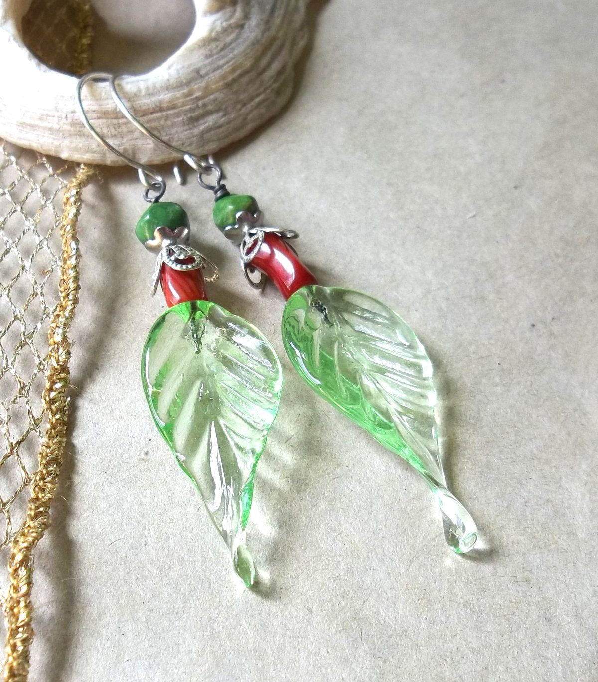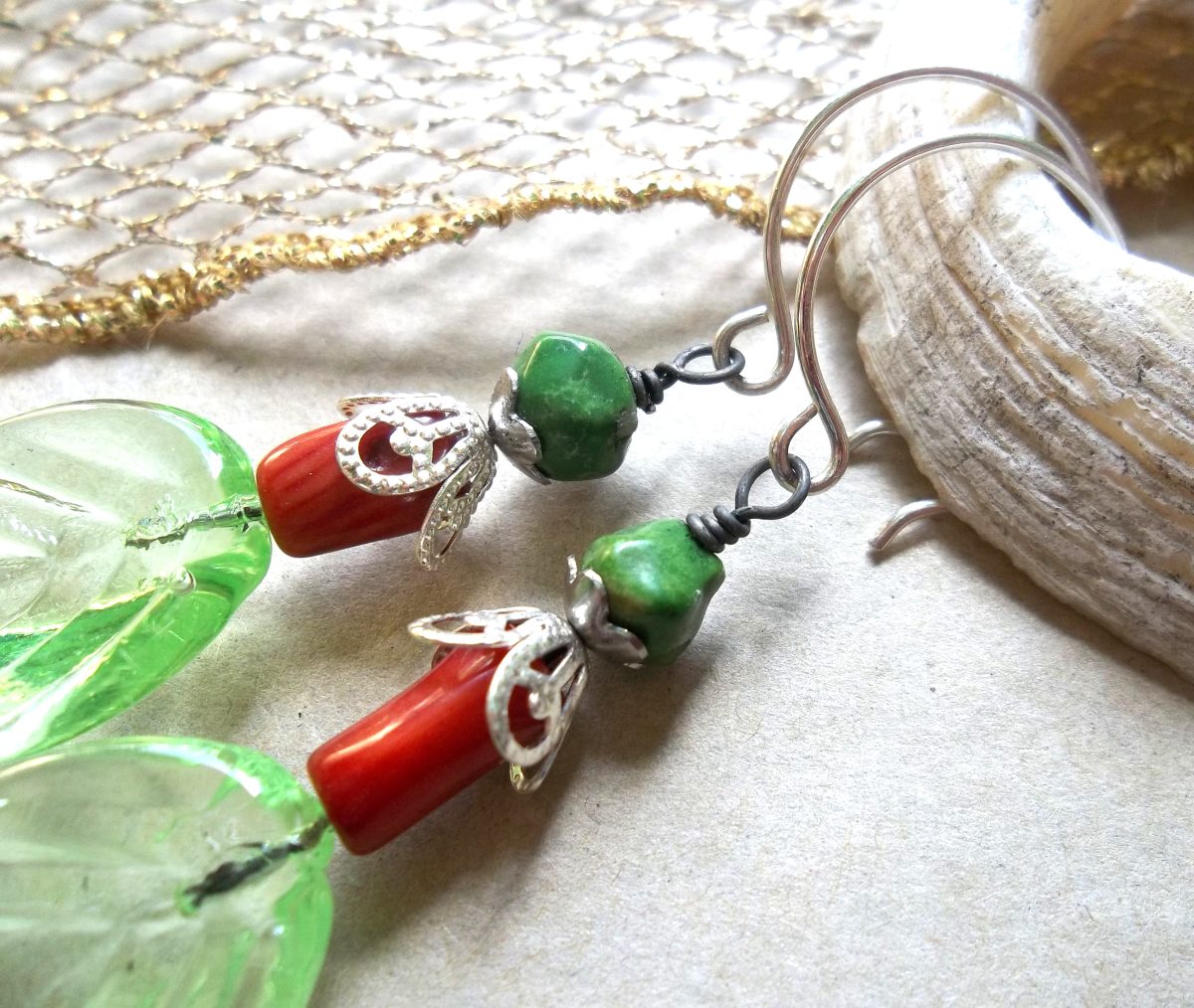 Recycled glass leaves, coral & Tibetan turquoise earrings. Sterling silver ear wires.