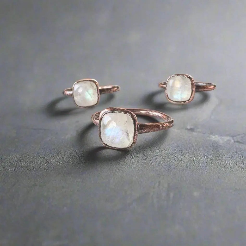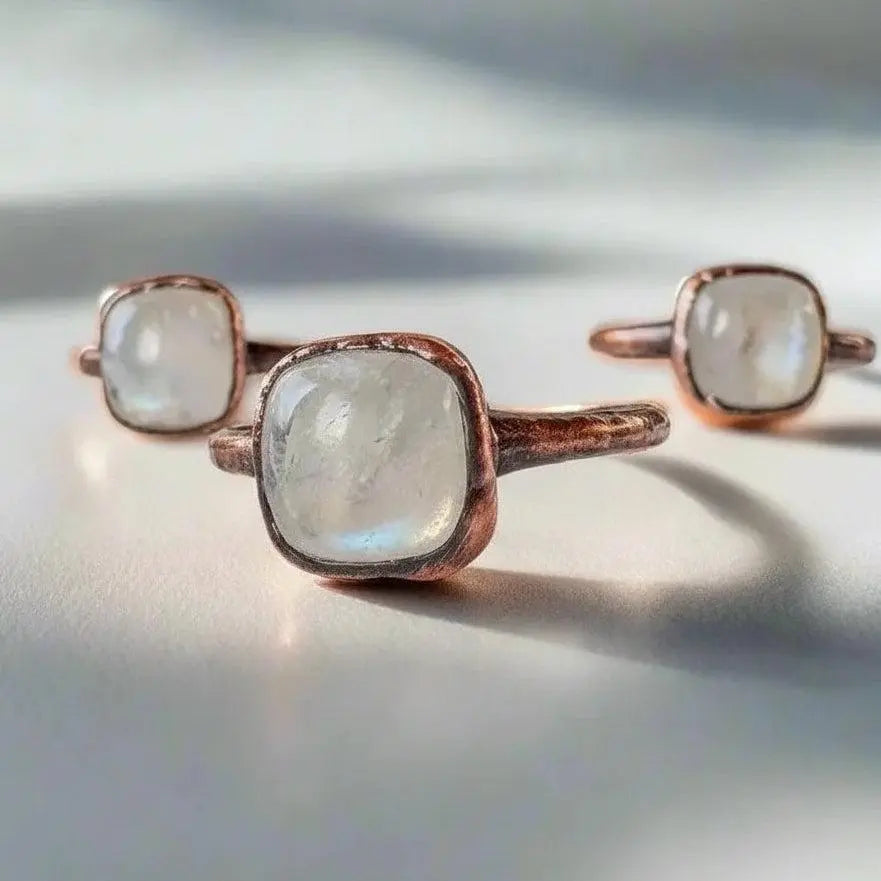 Moonstone is relatively soft, so treat this handcrafted ring gently to avoid impacts and scratches. The copper will develop a beautiful living patina over time—polish with a soft cloth if you prefer brightness. Cleanse energetically by placing in moonlight (moonstone loves lunar energy), on selenite, or with sage smoke. Avoid prolonged sunlight. Moonstone is a stone of intuition and emotional balance, so cleanse your moonstone ring regularly to maintain its gentle, intuitive energy.