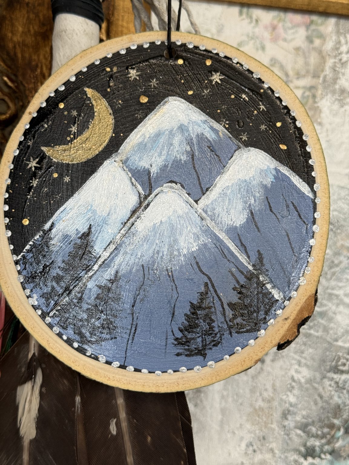 Will make a precious gift for anyone who loves nature, mountain air, mystical dark night skies, and mysterious crescent moons. Hang this art piece in a cozy nook in your home, on a door knob, in a window, or anywhere to add an extra touch of nature! Comes ready to hang with a waxed leather black cord.
