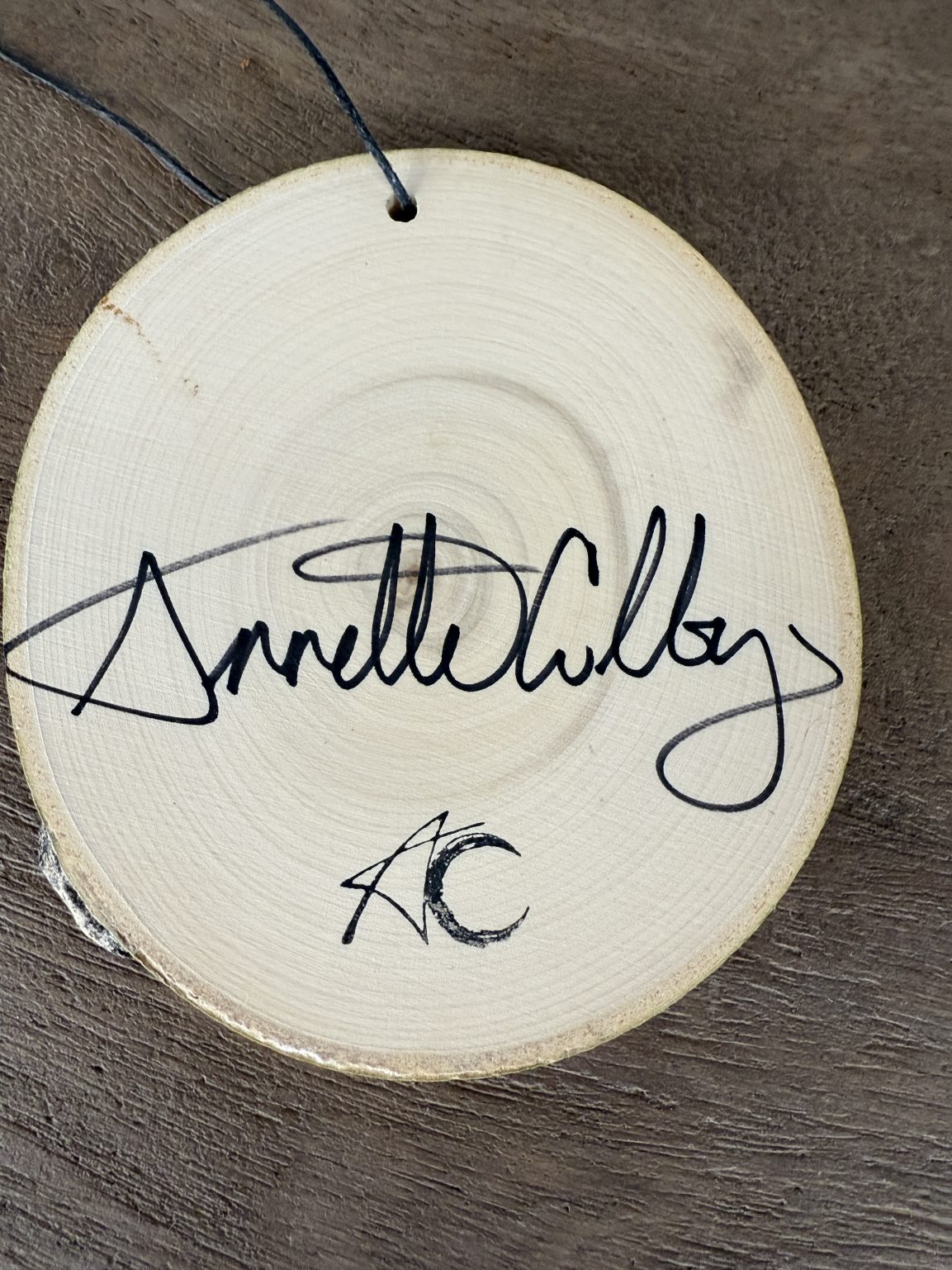 Hand painted on pre-sanded Aspen wood slice using professional quality acrylic paint. Signed by the artist (Annette Colby) on the back. Front is finished with a glaze of UV varnish to protect against moisture, sunlight and dust damage. Your original painted Aspen Slice arrives signed on the back, stamped with a Santa Fe logo, and in a beautifully wrapped gift box. Free Shipping.