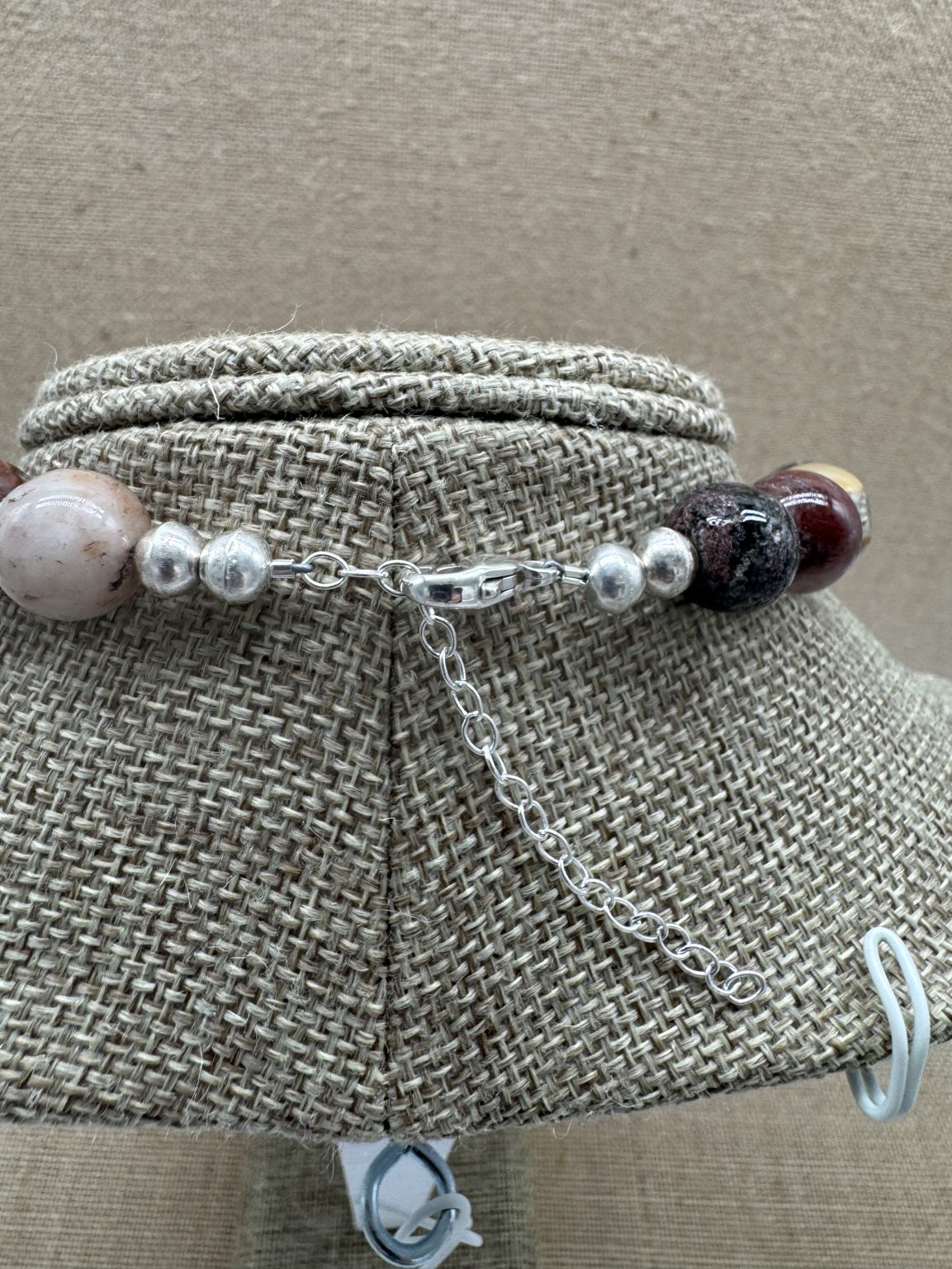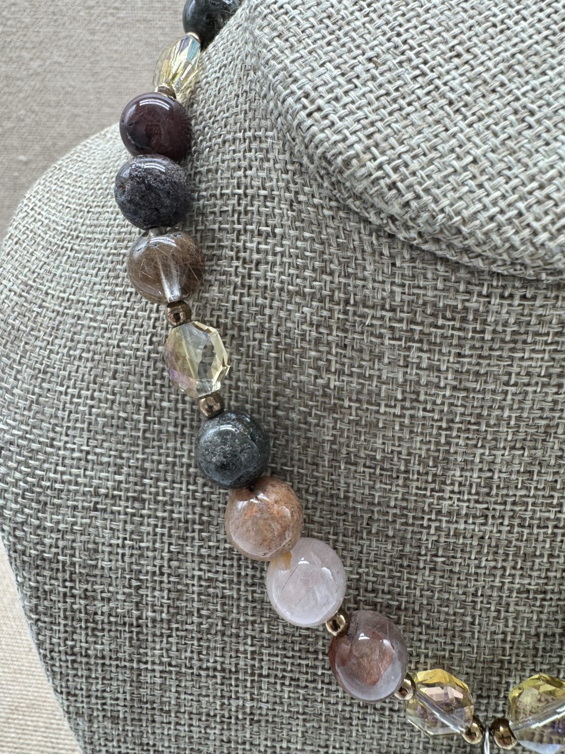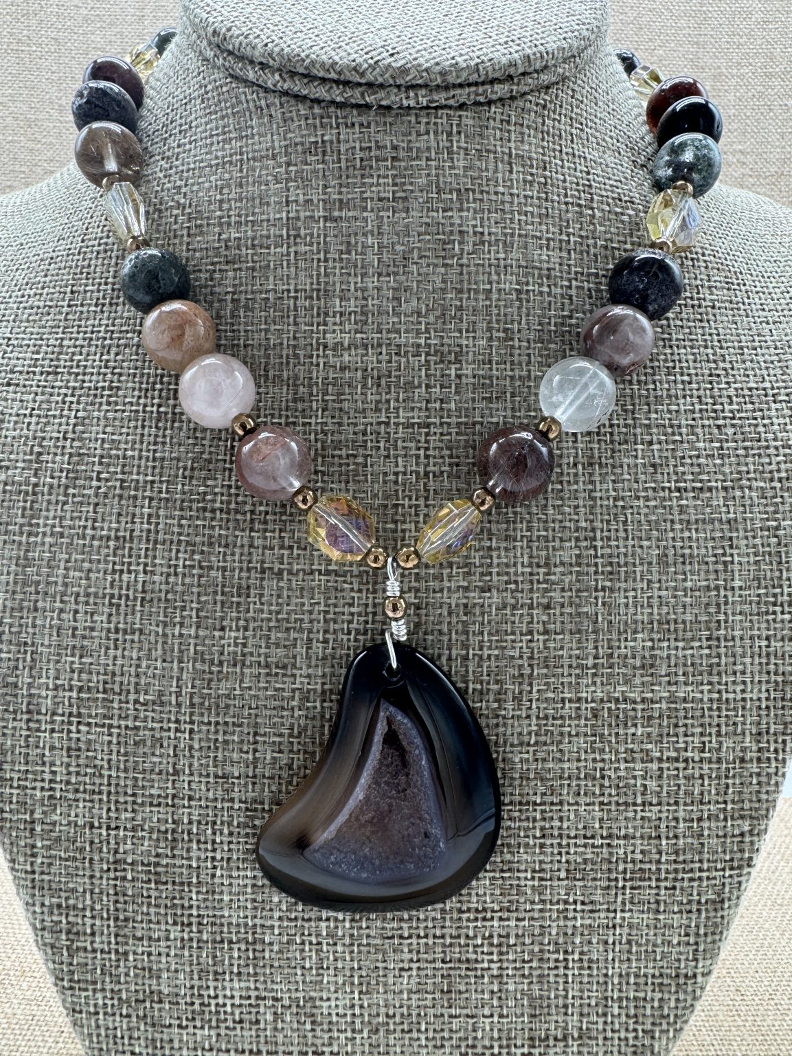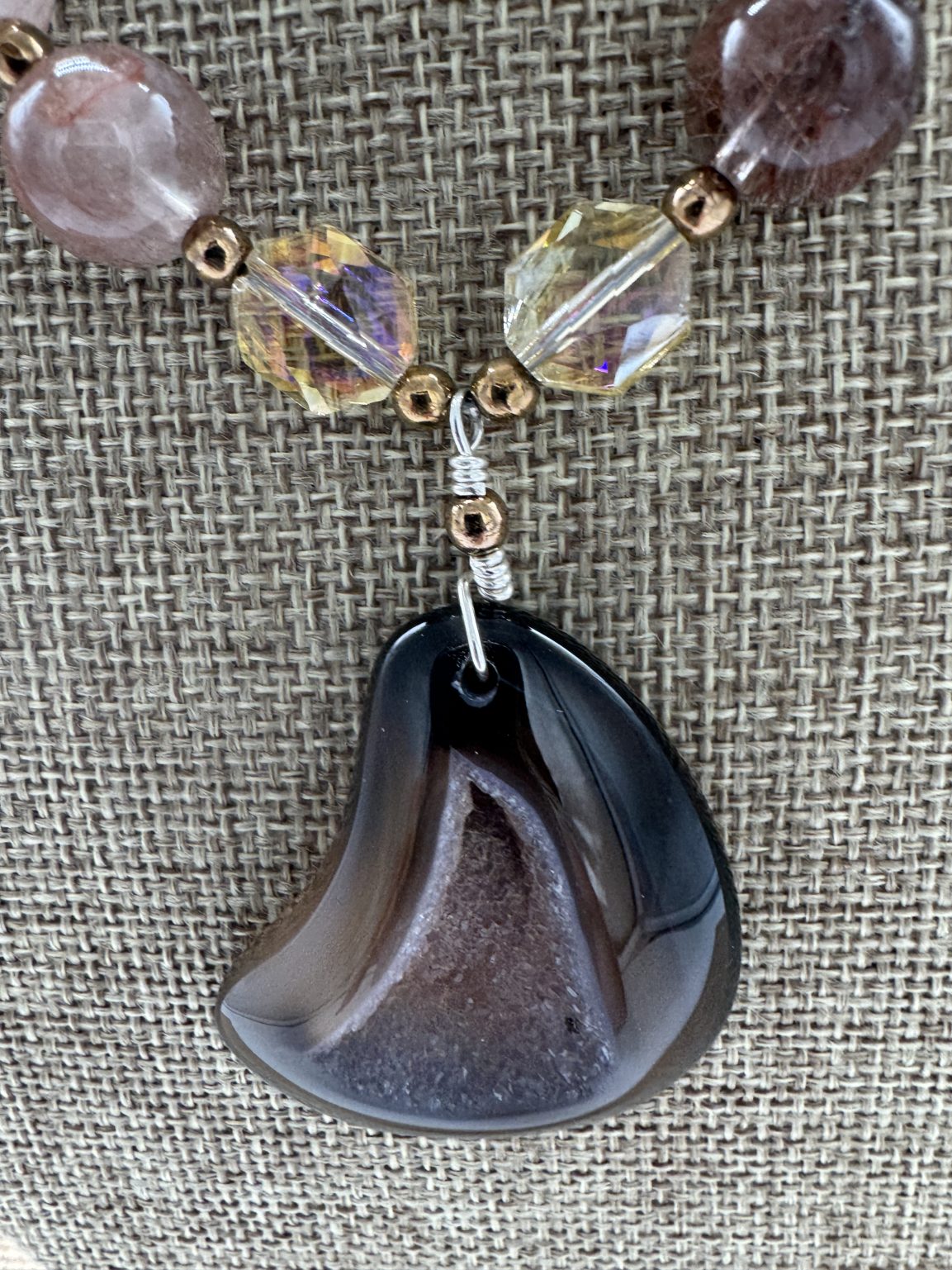 Necklace: Druzy Sparkle Brown Tones Freeform 1 ¾” with Rutile Quartz, Faceted Czech Glass Beads 16″+2″ Sterling Extender. One of a Kind