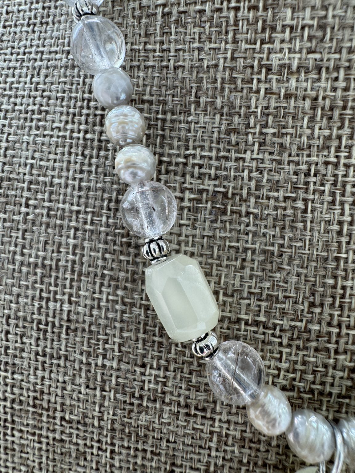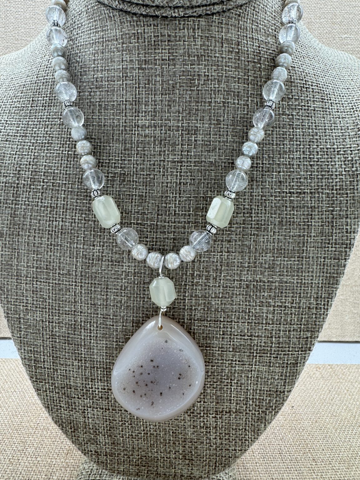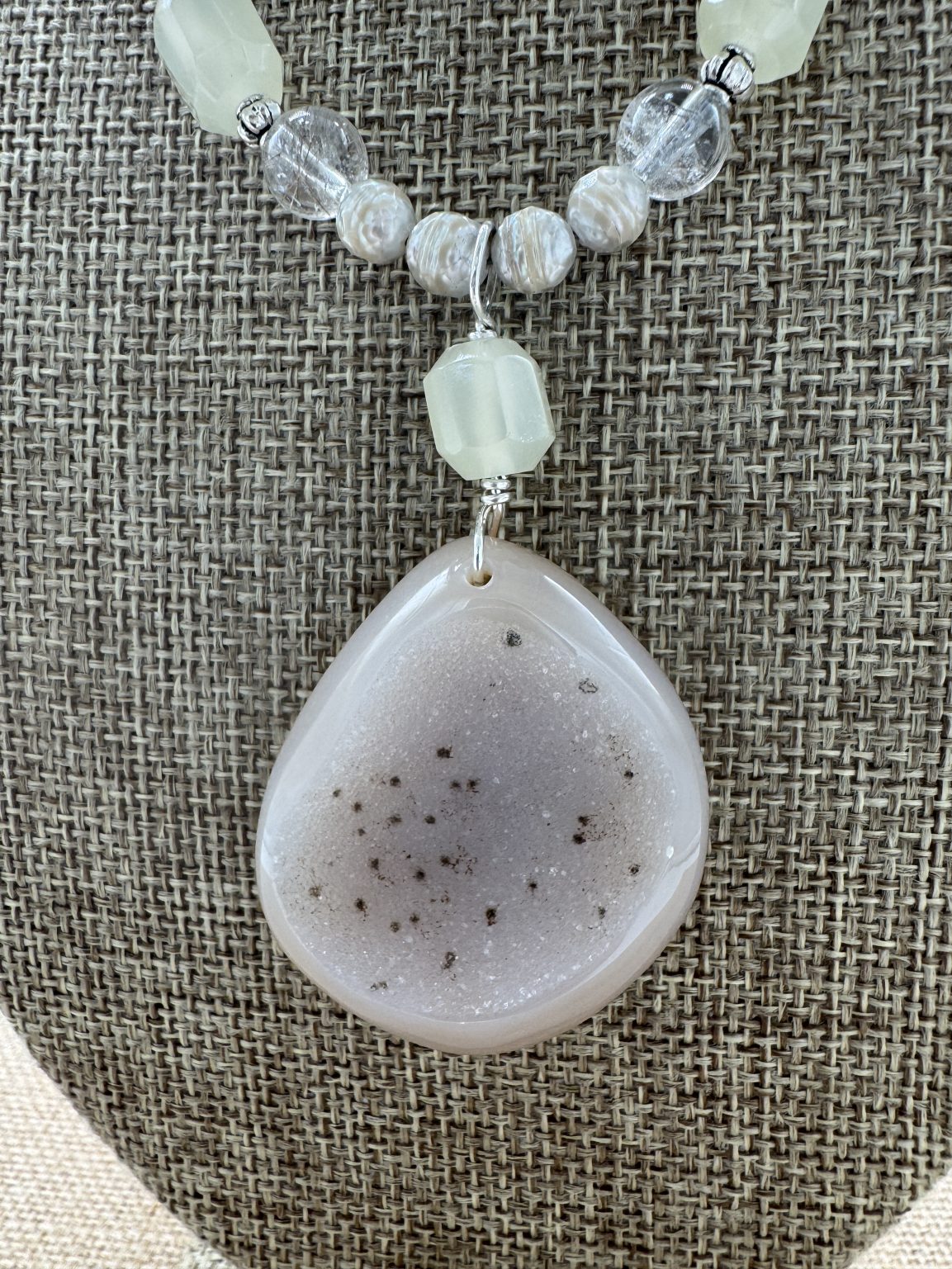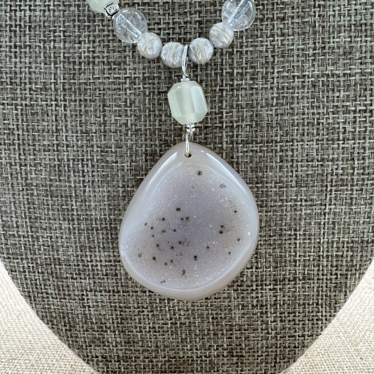 Necklace: Druzy Spotted Freeform 1 ½”, Faceted Cultured Pearls, Rutile Quartz 16″+2″ Sterling Extender. One of a Kind