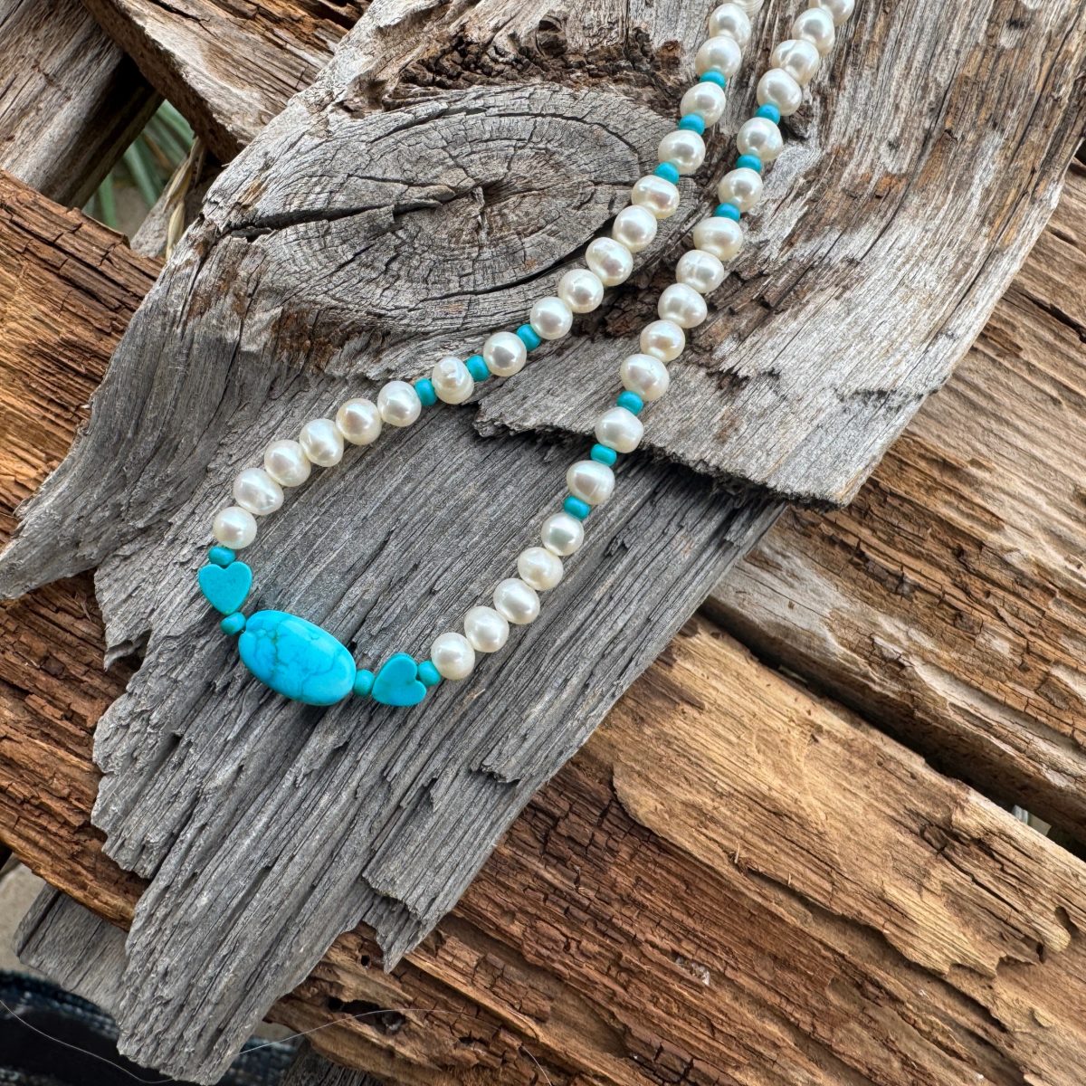 Necklace: Turquoise Oval Center Stone, 6mm Heart Accents & Cultured Pearls, Sterling Clasp 16″ or 19″ + 2″ extender chain