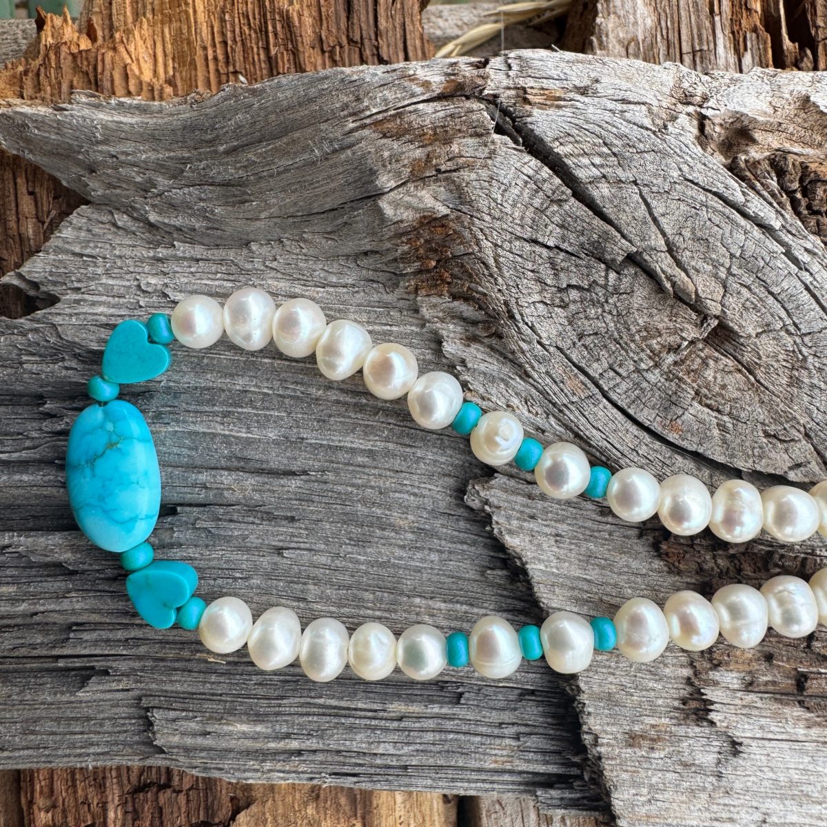 Necklace: Turquoise 9mmX14mm oval 6mm Hearts & Cultured Pearls, Sterling Clasp 16″ or 19″+2″ extender chain