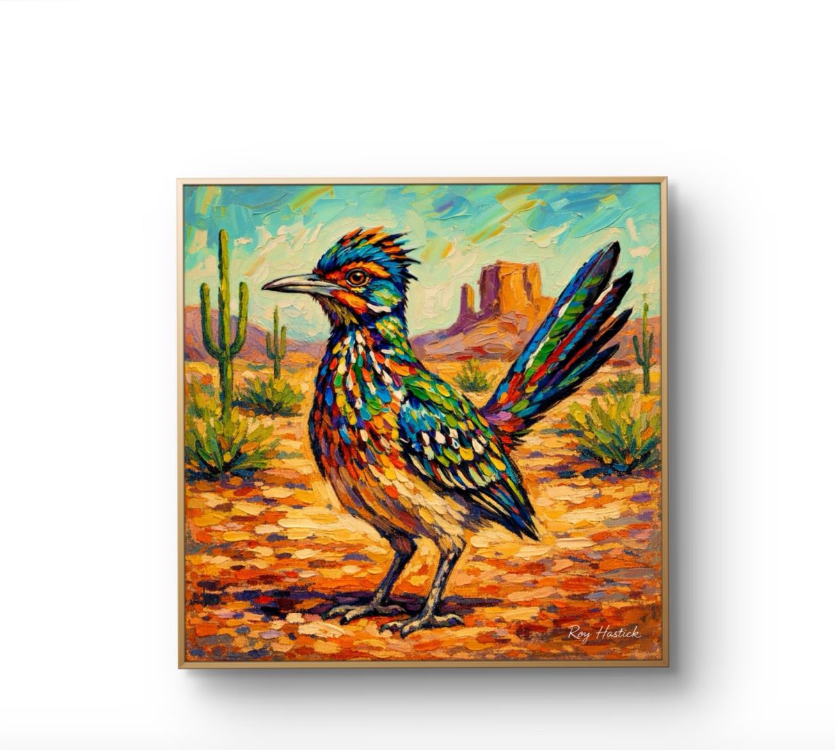 The bird’s plumage is a kaleidoscopic explosion of sapphire, emerald, and fiery orange, set against a sun-drenched desert backdrop of warm ochres and saguaro greens. This piece embodies the “Return of the Hand,” showcasing raw, visible human touch and a joyful, rhythmic texture that celebrates the rugged beauty of the high desert.