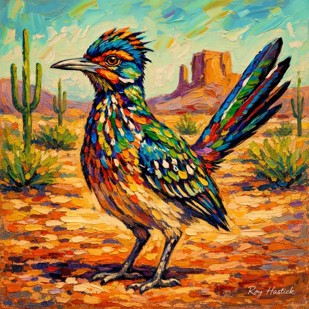 This striking oil pastel work captures the spirited essence of a Southwestern roadrunner through a lens of Vibrant Lyrical Abstract Expressionism. Using thick, “buttered” applications of color and aggressive palette knife strokes, the artist creates a 3D sculptural relief that leaps off the canvas.