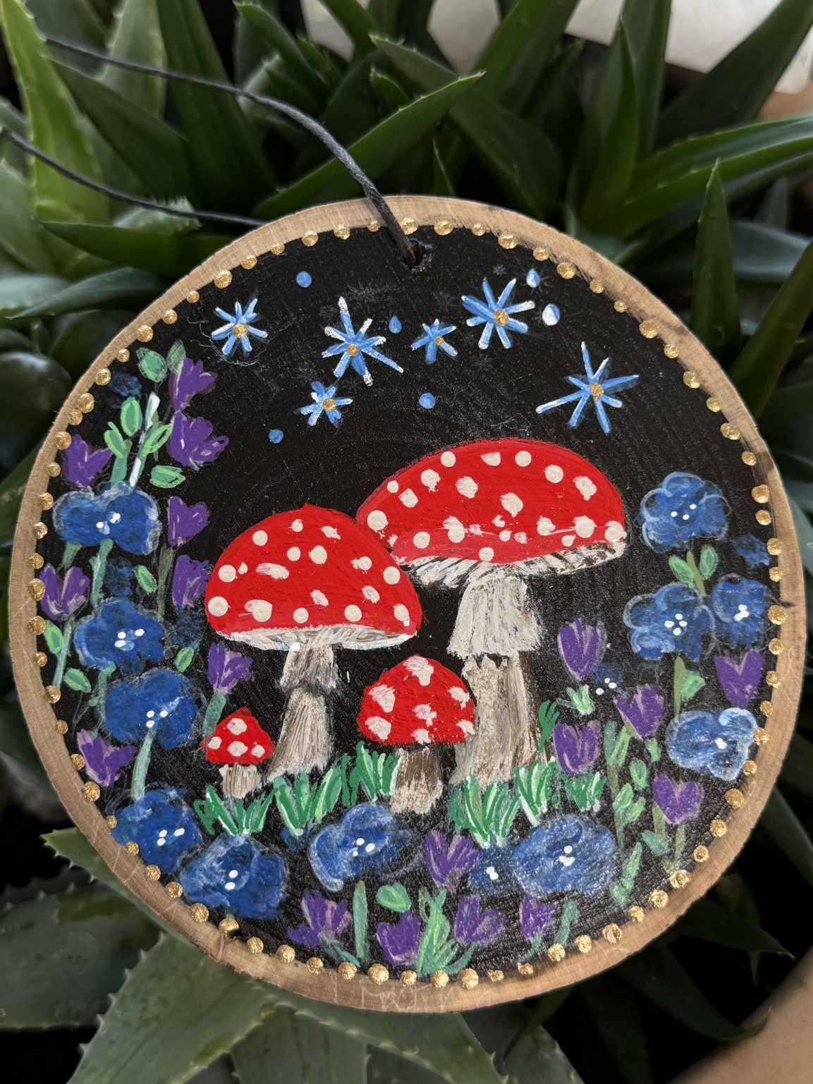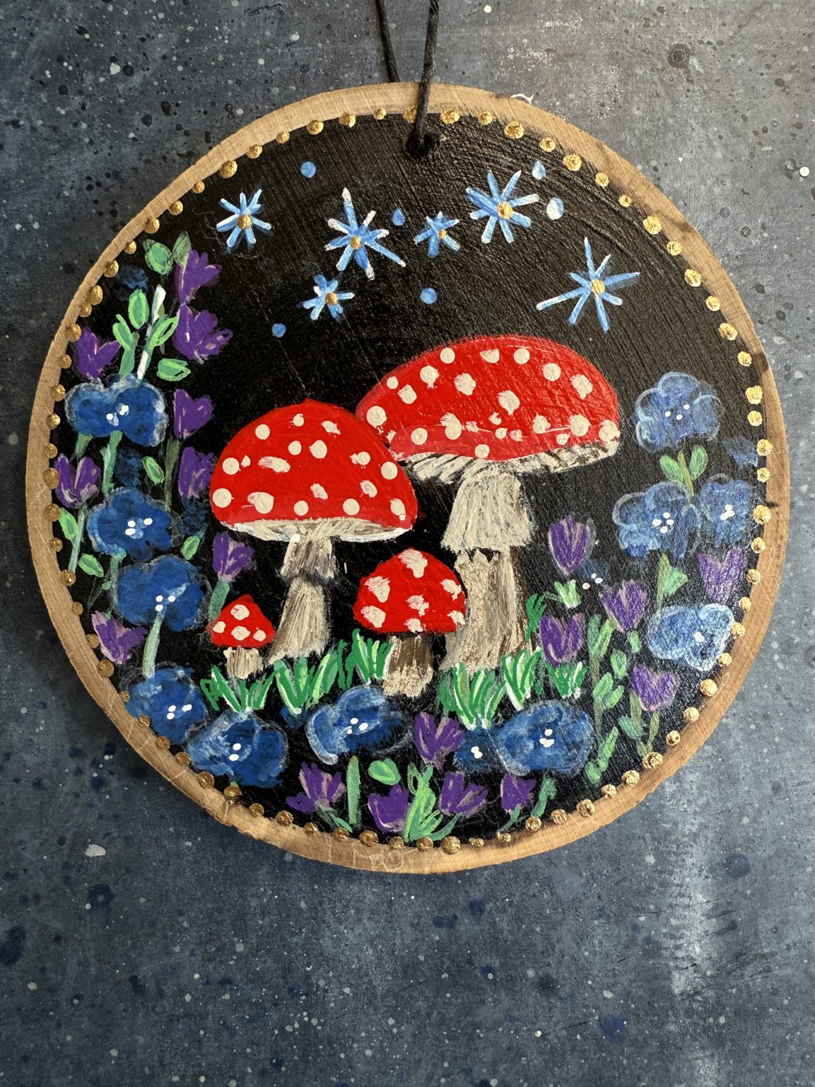Will make a precious gift for anyone who loves nature, red capped mushrooms, mystical dark night skies, and flowers. Hang this art piece in a cozy nook in your home, on a door knob, in a window, or anywhere to add an extra touch of nature! Comes ready to hang with a waxed leather black cord.