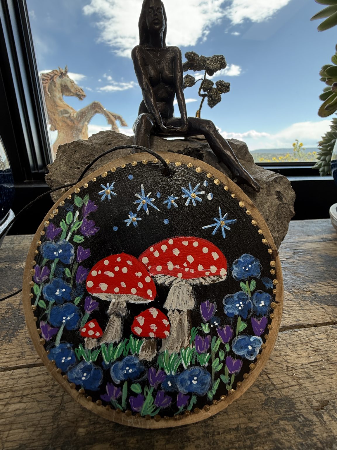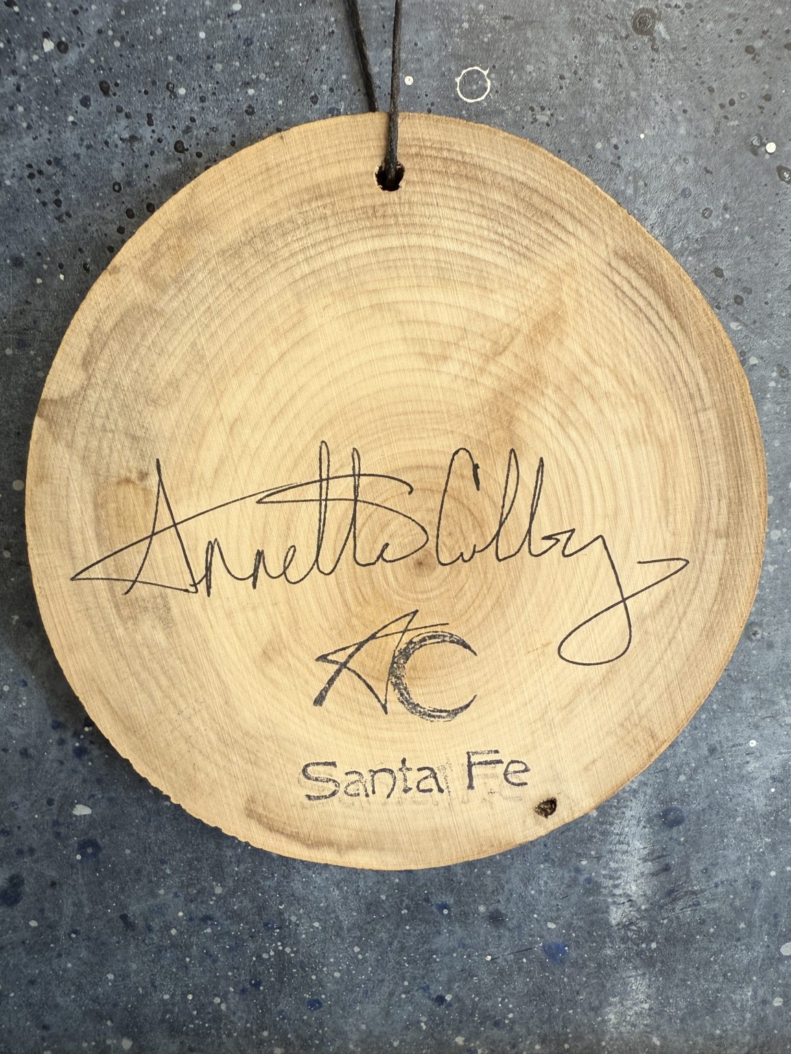 Hand-painted in Santa Fe, NM by Annette Colby on an Aspen wood slice from the mountains of Northern New Mexico with professional acrylic paint and acrylic sealer, black waxed leather cord, love and magic.