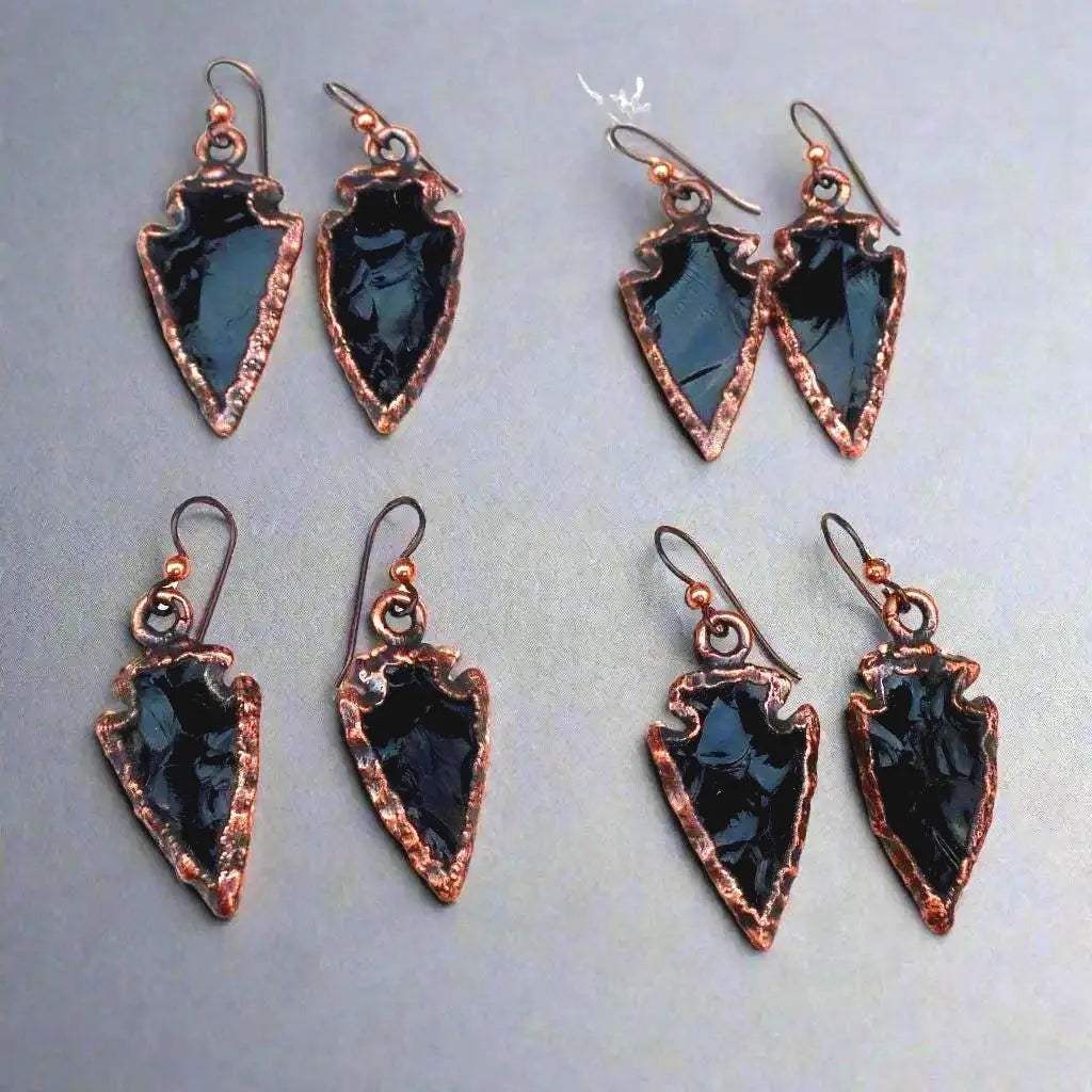 Materials & Process: Each pair is created through a slow electroforming technique where pure copper is grown around individual obsidian arrowheads, preserving each stone’s raw silhouette and polished facets. Pieces are hand-finished, textured, and sealed with a protective coating to ensure lasting wear. This is handcrafted copper jewelry made in small batches—one-of-a-kind, durable, and intentionally made to age with you.