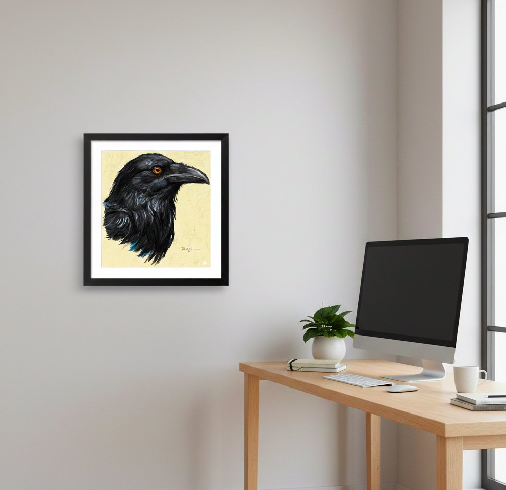 Description: This striking portrait captures the profound intelligence and enigmatic presence of the raven. Painted with a focus on tactile texture, the obsidian feathers are rendered with deep blacks, accented by lyrical strokes of slate and cerulean that catch the light. The sharp, amber eye serves as a soulful focal point, grounding the expressive energy of the piece.