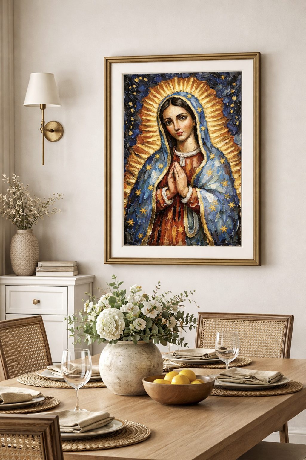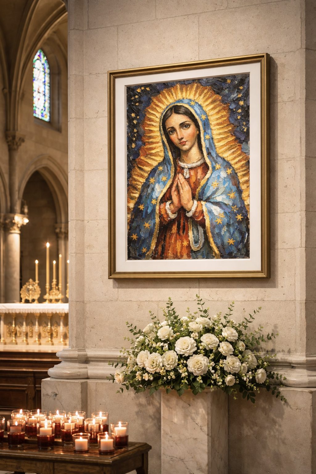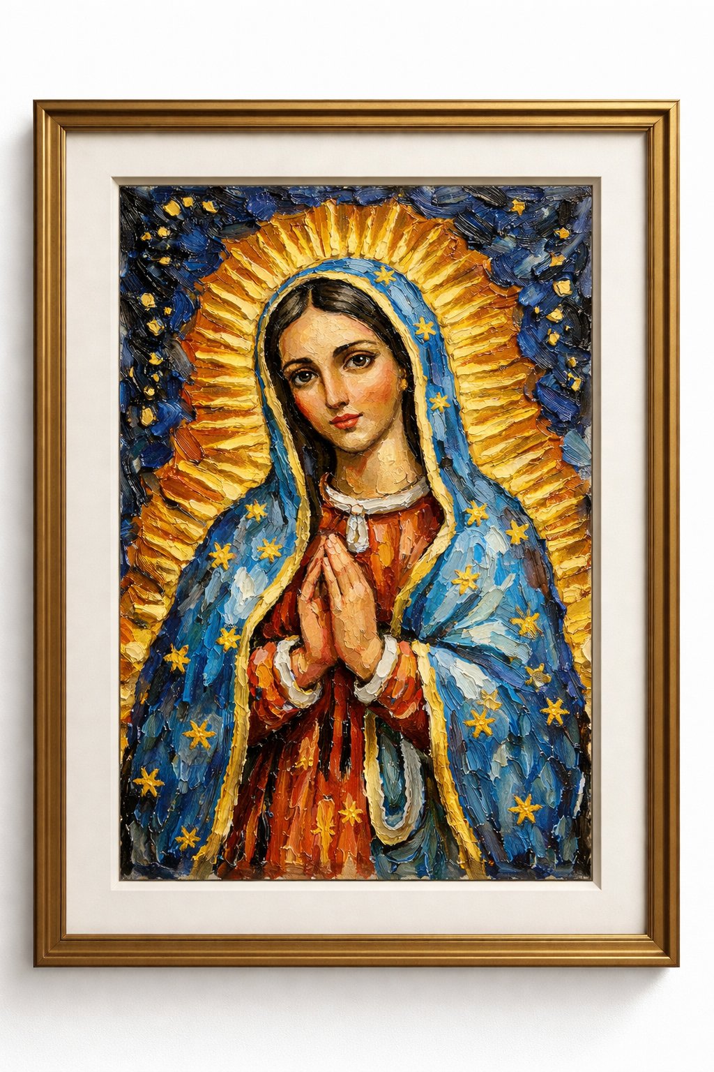 Our Lady of Guadalupe, MINI style, Roy Hastick, Vibrant Lyrical Abstract Expressionism, impasto, palette knife, religious icon, radiant halo, mandorla, starry mantle, texture, bold brushstrokes, spiritual art, gold and azure, expressive devotion, contemporary folk art