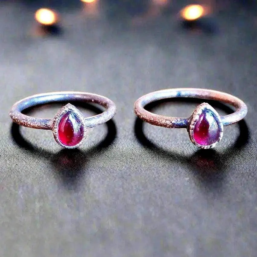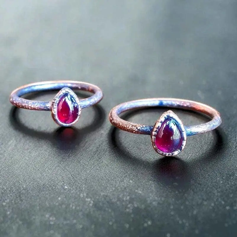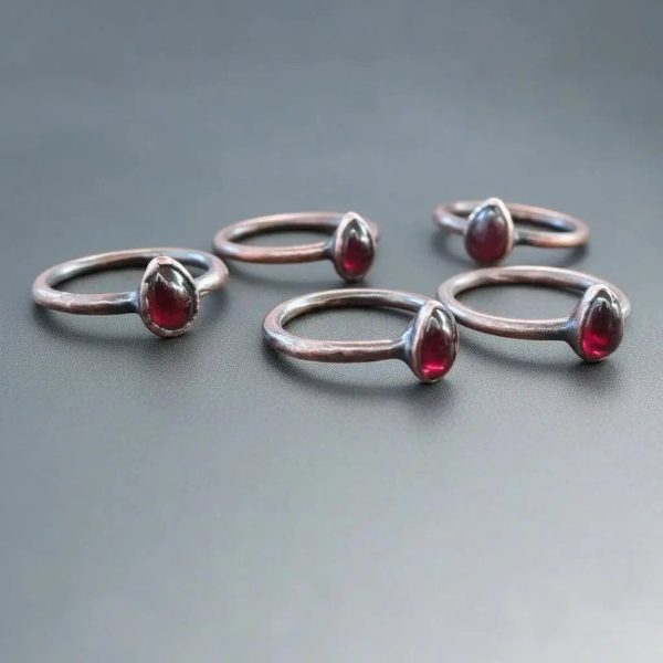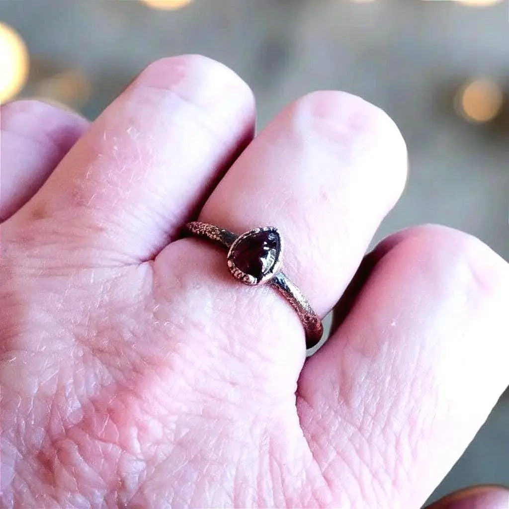 Short Description: Handcrafted in copper with a pear-shaped garnet, this handmade crystal jewelry ring anchors vitality, focus, and grounded energy for daily ritual adornment—connecting earth materials to mindful living.